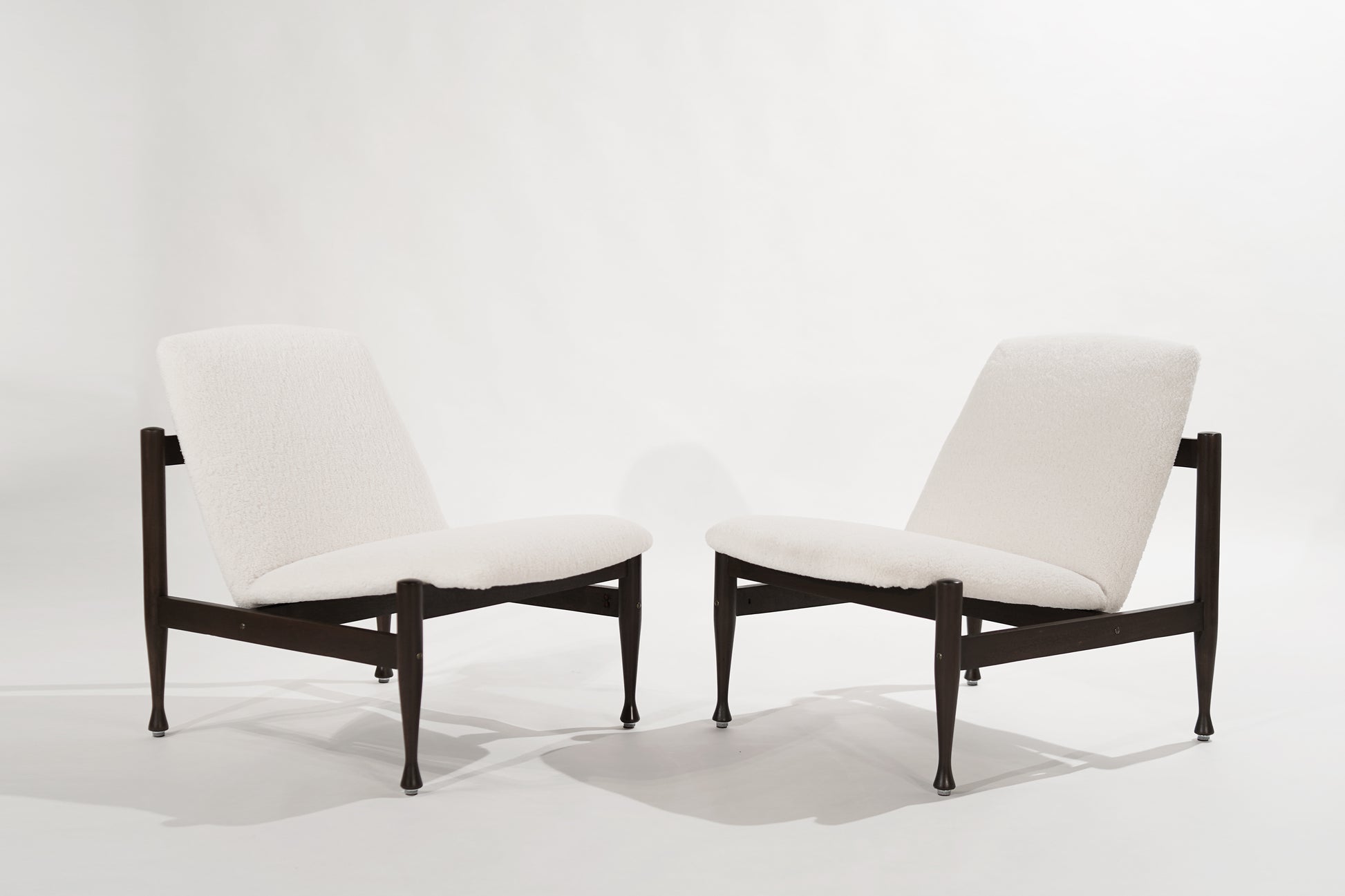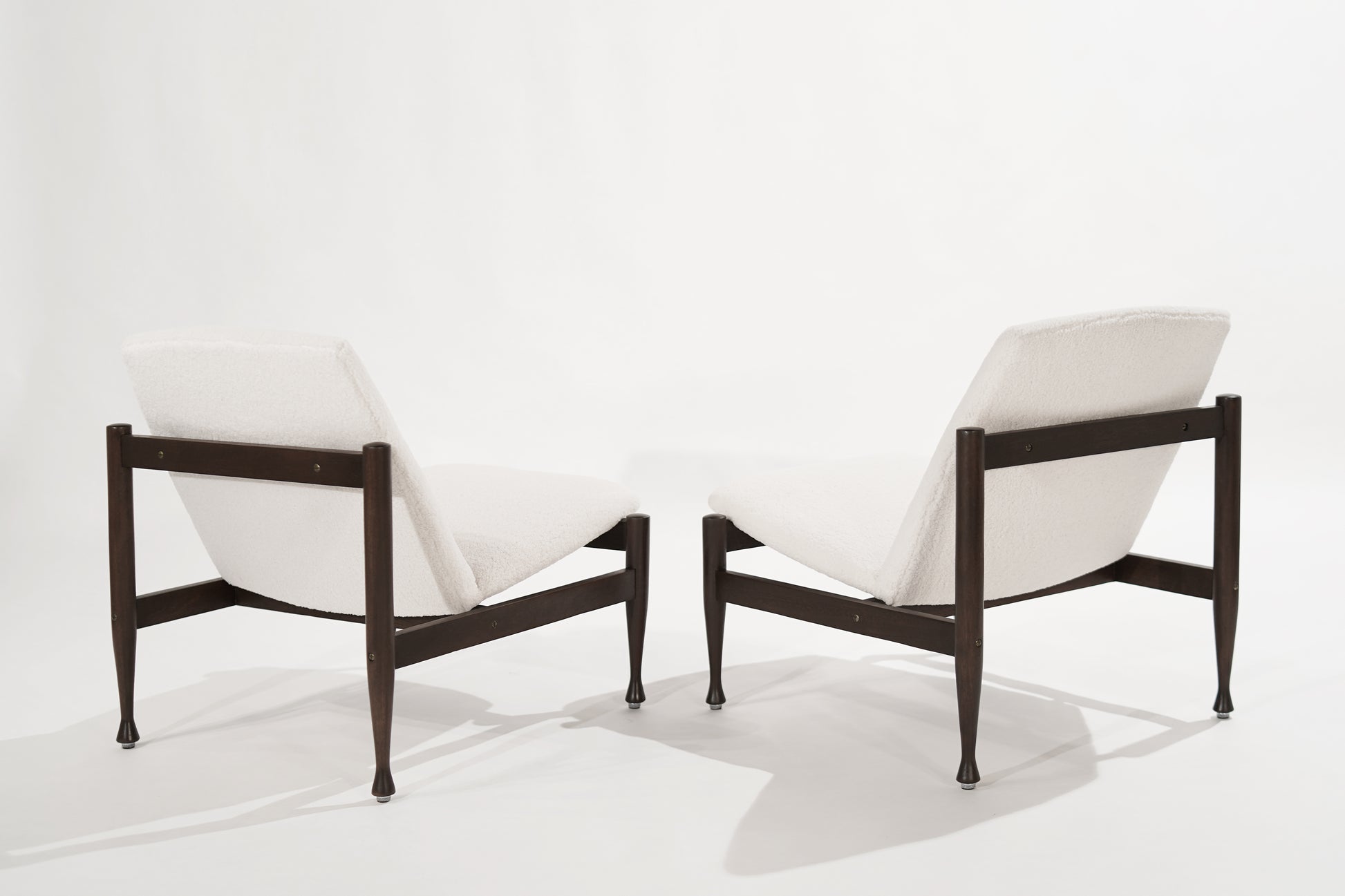 A beautiful Scandinavian-Modern set of lounge chairs in the style of the iconic "Japan Chair" by Finn Juhl, original from Denmark, circa 1950-1959. Completely restored, brass fittings and screws have been refinished in antique brass, walnut framework redone in dark walnut, and reupholstered in heavy wool by Kravet.