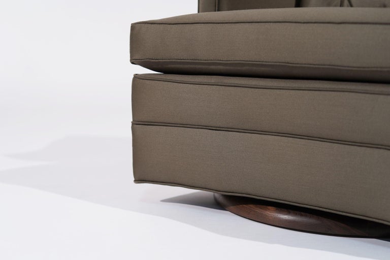 A timeless duo of vintage swivel chairs inspired by the iconic style of Edward Wormley for Dunbar. These chairs, meticulously restored to their original glory, exude mid-century elegance and sophistication. Upholstered in luxurious olive green silk, the chairs offer a sumptuous seating experience that complements any interior with a touch of opulence. Supported by solid walnut bases, these chairs not only boast exquisite craftsmanship but also ensure durability and stability.