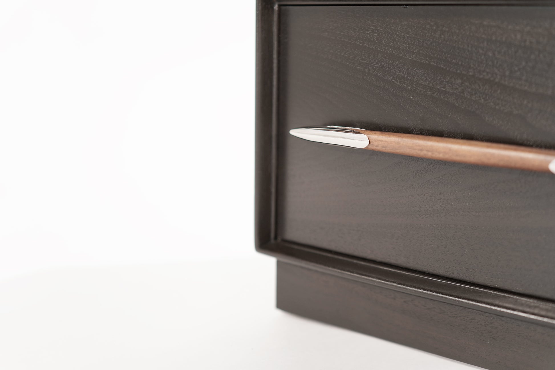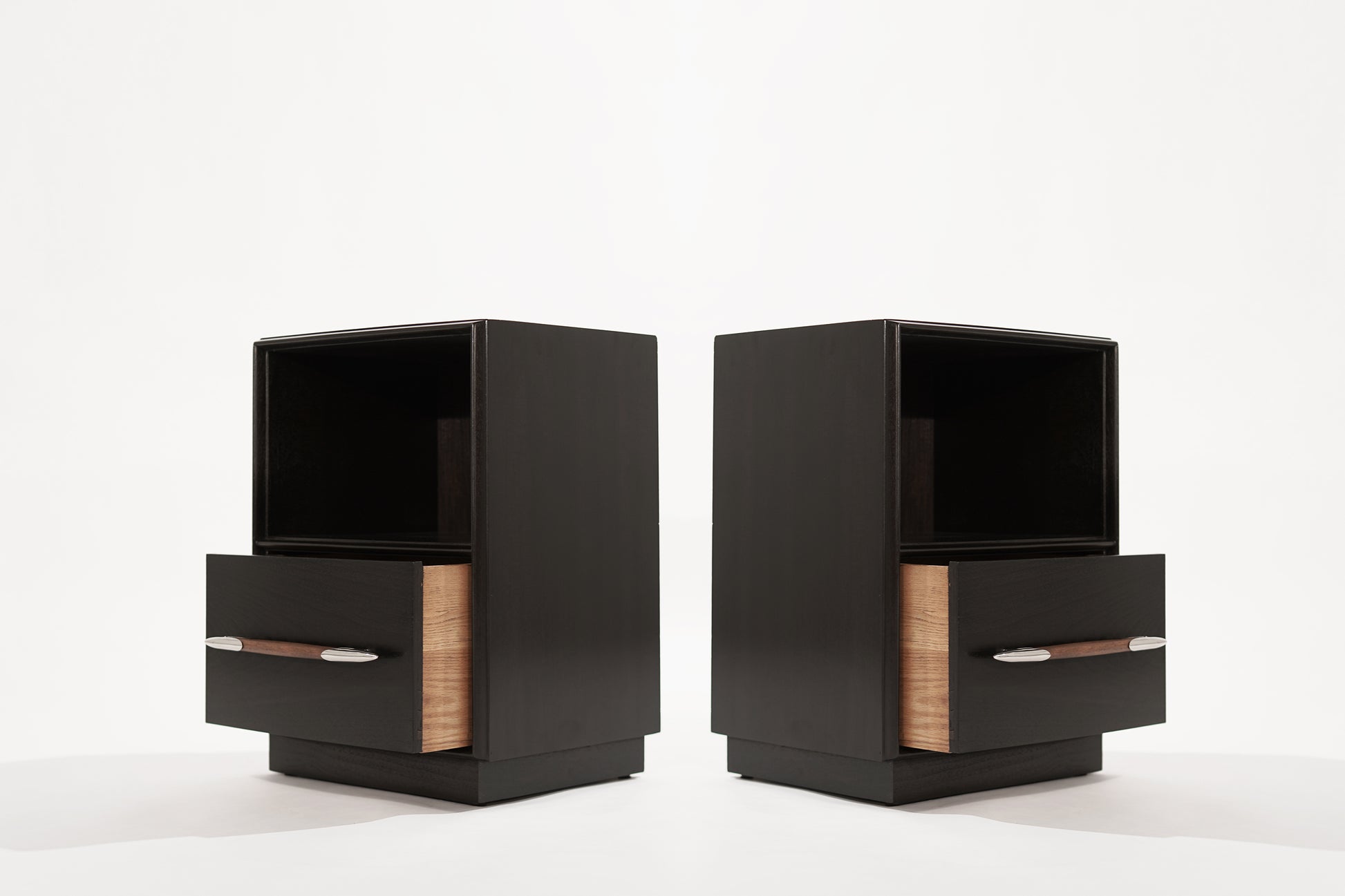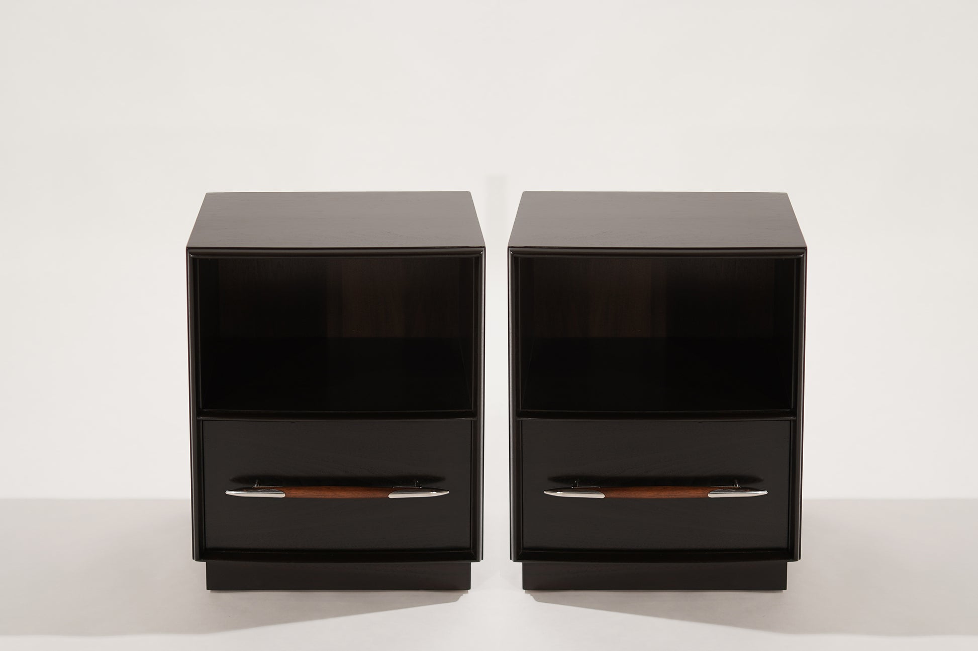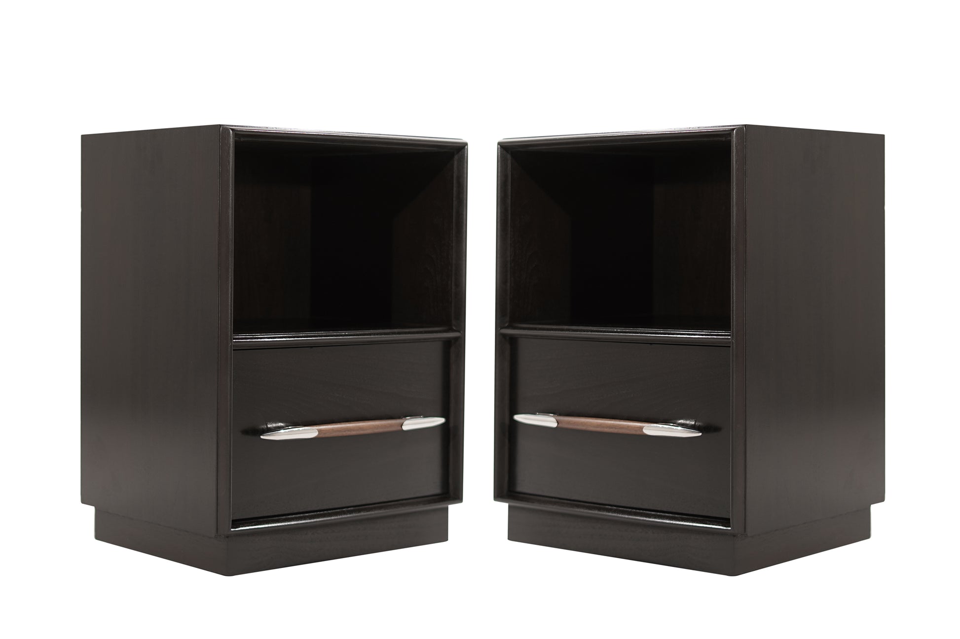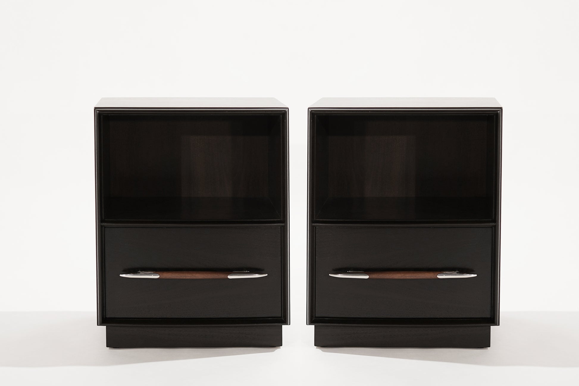 Set of nightstands designed by T.H. Robsjohn-Gibbings for Widdicomb, circa 1950-1959. Executed in walnut, completely restored in our dark walnut finish, featuring contrasting natural walnut wood handles and nickel hardware.