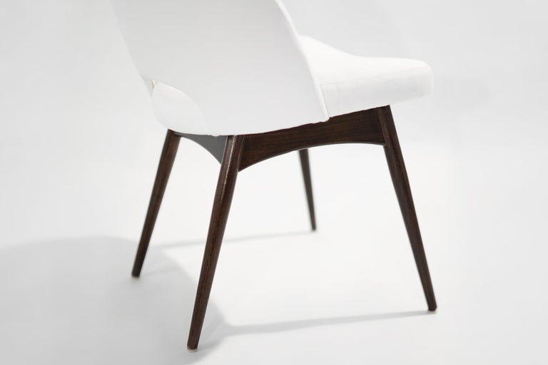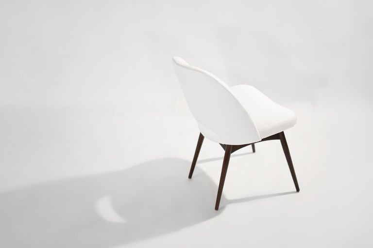 Compass dining table, paired with Model 1404-C chairs designed By Adrian Pearsall for Craft Associates, circa 1950s. The sculptural walnut frame of the table has been fully restored, it has also been fitted with a new tempered glass top. We've reupholstered the chairs in white linen by Holly Hunt. Walnut bases have been restored and re-stained in a way to match the finish on the table.