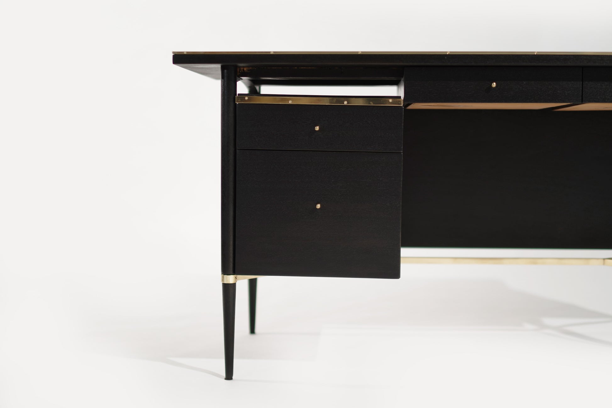 Ebonized Mahogany Desk from Paul McCobb's Connoisseur Collection, meticulously restored by Stamford Modern. Crafted in the 1950s, this mid-century icon boasts minimalistic lines and a sleek silhouette. Brass accents add luxury, emphasizing clean lines. With four spacious drawers, it seamlessly combines style and functionality, offering ample storage for office essentials. Stamford Modern's restoration preserves the original charm, making it a testament to McCobb's visionary design.
