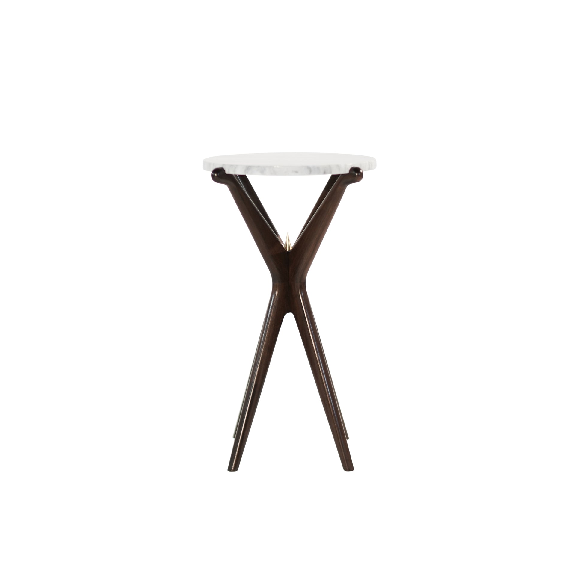 Demure curves pair with unexpected sharpness. This solid walnut table has a lightweight aesthetic balanced on strong, hand-sculpted legs. Featuring a grey polished marble top for a natural approach to modernism. A small brass "spear-tip" shines at the center, inspired by iconic Italian furniture designer Gio Ponti.