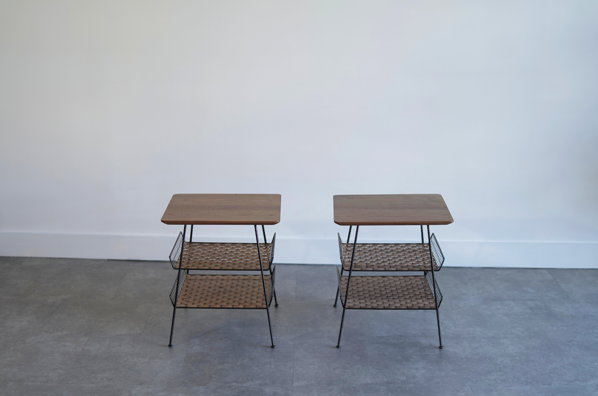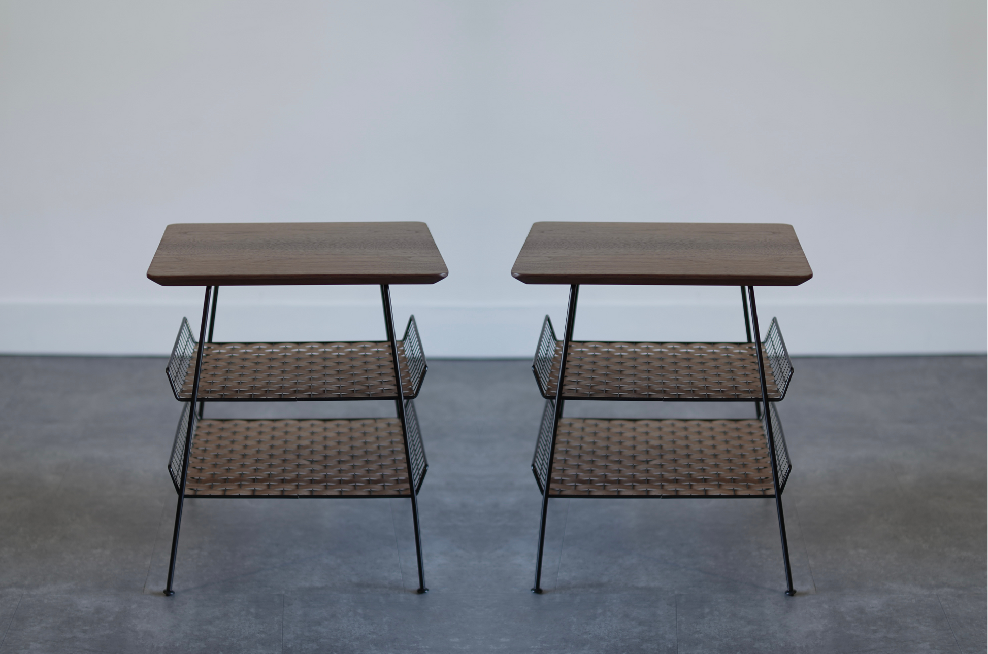 A striking pair of industrial side tables by Tony Paul, circa 1960s, fully restored by Stamford Modern. Featuring solid walnut tops and handwoven walnut shelves, these tables showcase Paul’s signature blend of warmth and functionality. The wrought iron frames have been newly powder-coated for a sleek, durable finish, enhancing their timeless appeal. A perfect balance of mid-century design and craftsmanship.