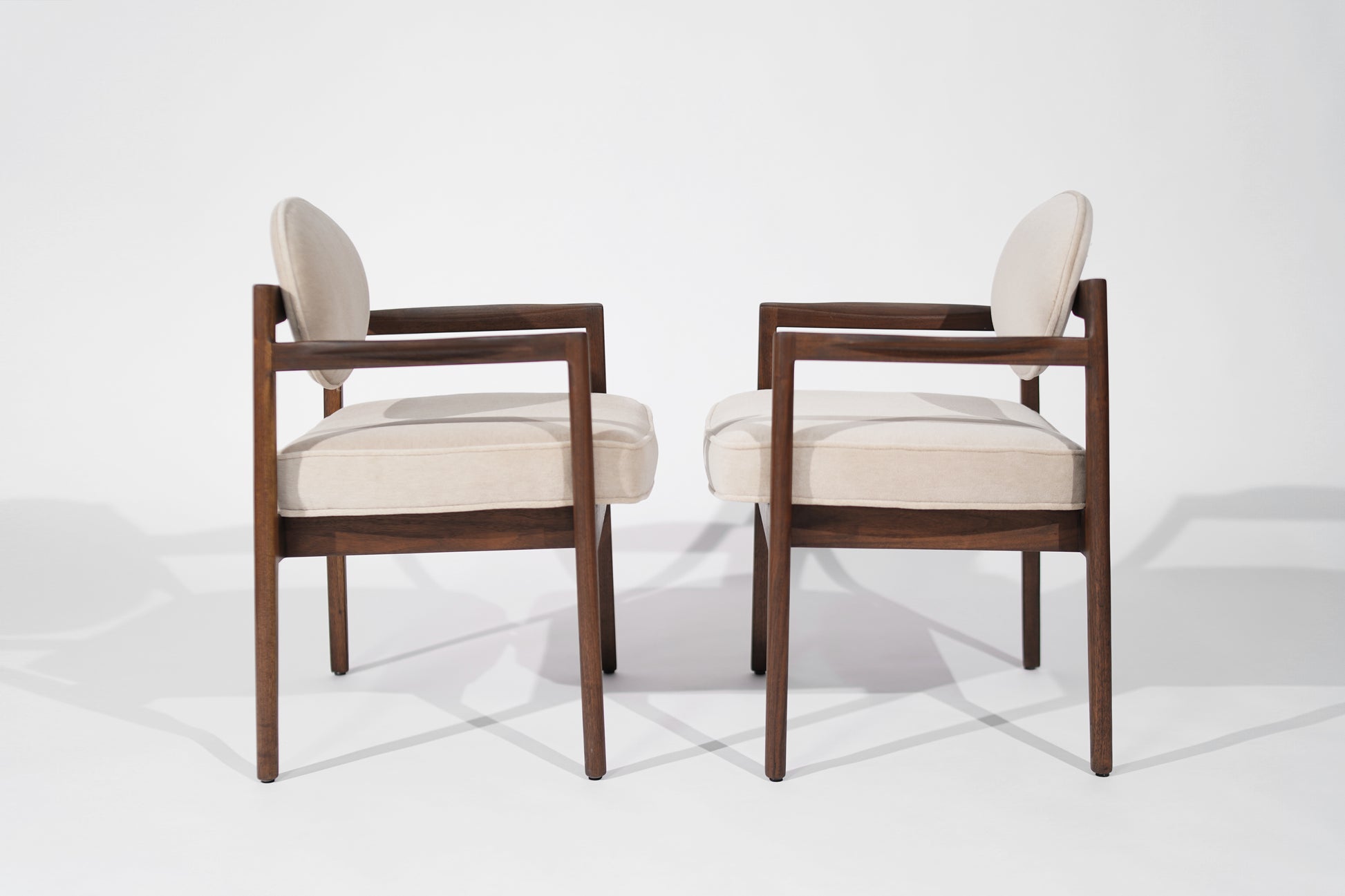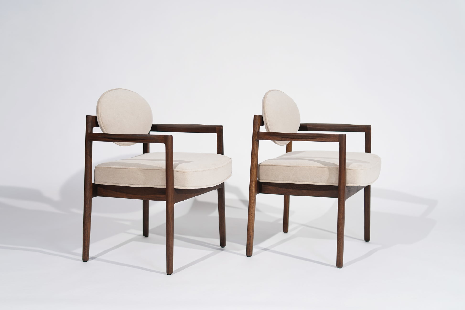 An exquisite pair of mid-century modern armchairs designed by Jens Risom, crafted circa 1960-1969. Meticulously restored, the walnut framework shines with renewed beauty, complemented by a luxurious reupholstery in natural mohair. A perfect blend of vintage charm and contemporary comfort, these armchairs are a statement piece for any discerning home.