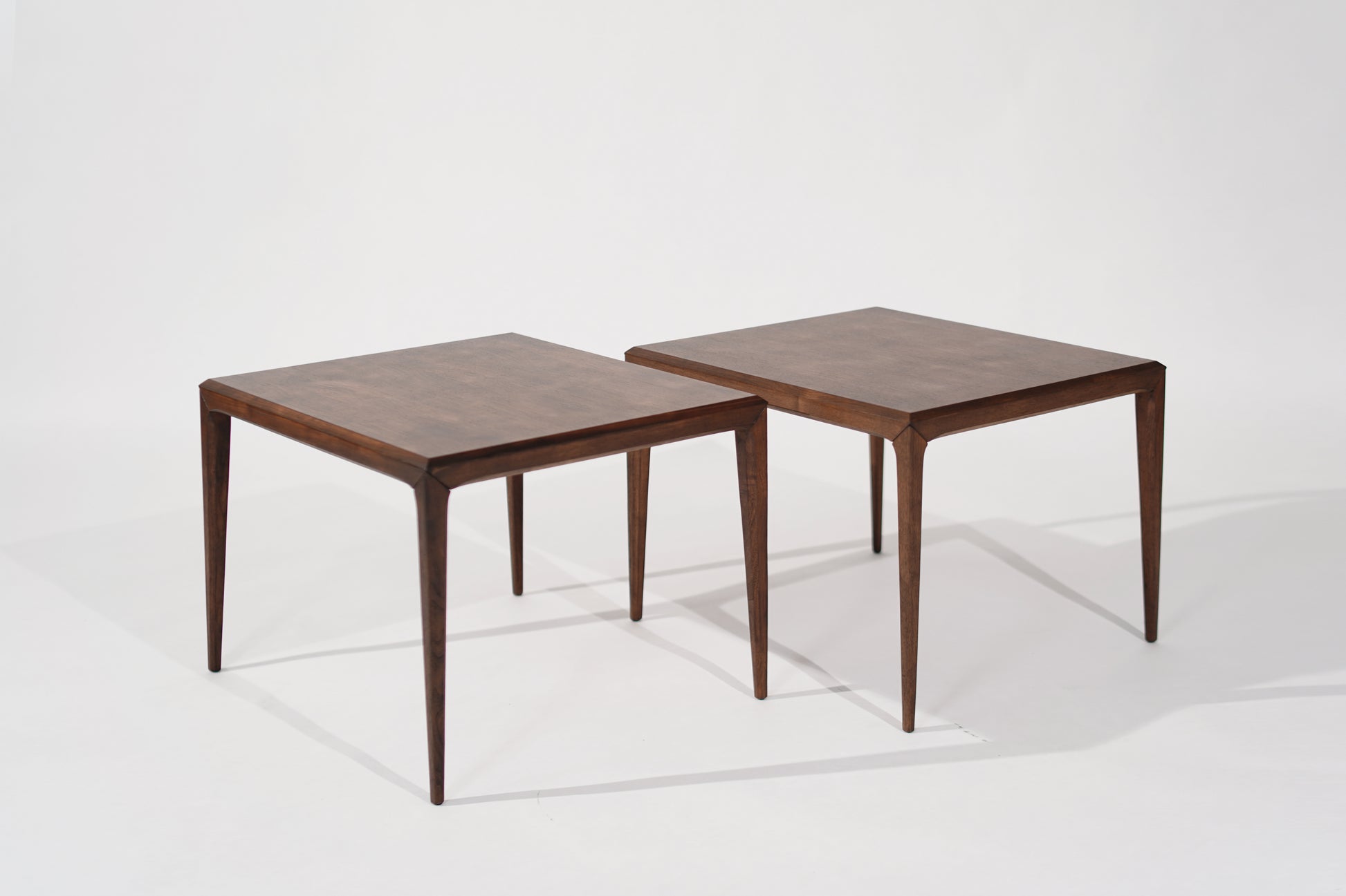 Enhance your space with this set of large-scale teak end tables by Johannes Andersen for CFC Silkeborg, Denmark, circa 1950s. Fully restored to their original elegance, these tables exhibit the timeless appeal of mid-century Danish design. With sleek lines and tapered legs, they add a touch of modern sophistication to any room. Perfect as side tables or nightstands, these pieces are a testament to Andersen's craftsmanship and the beauty of Danish design.
