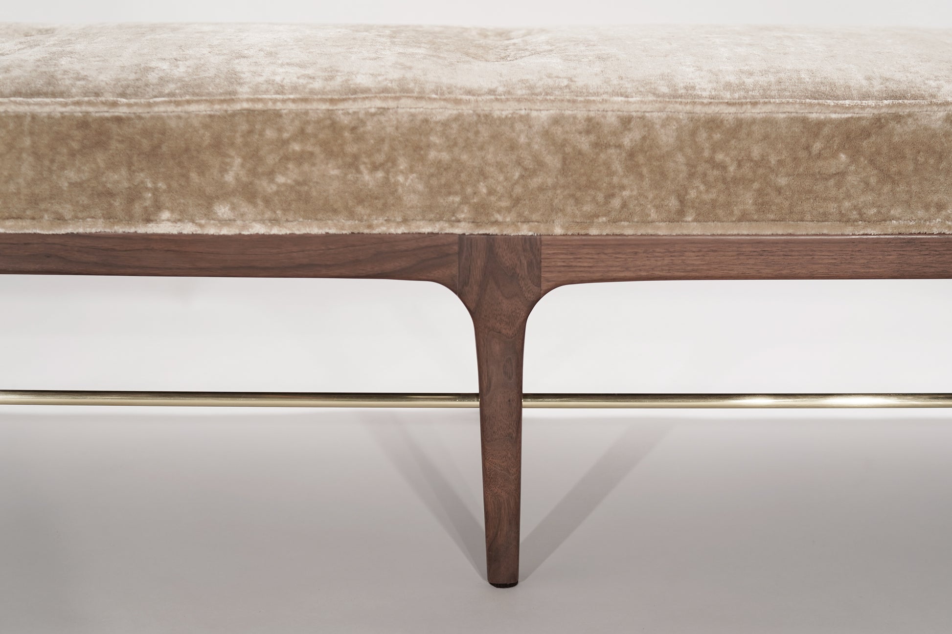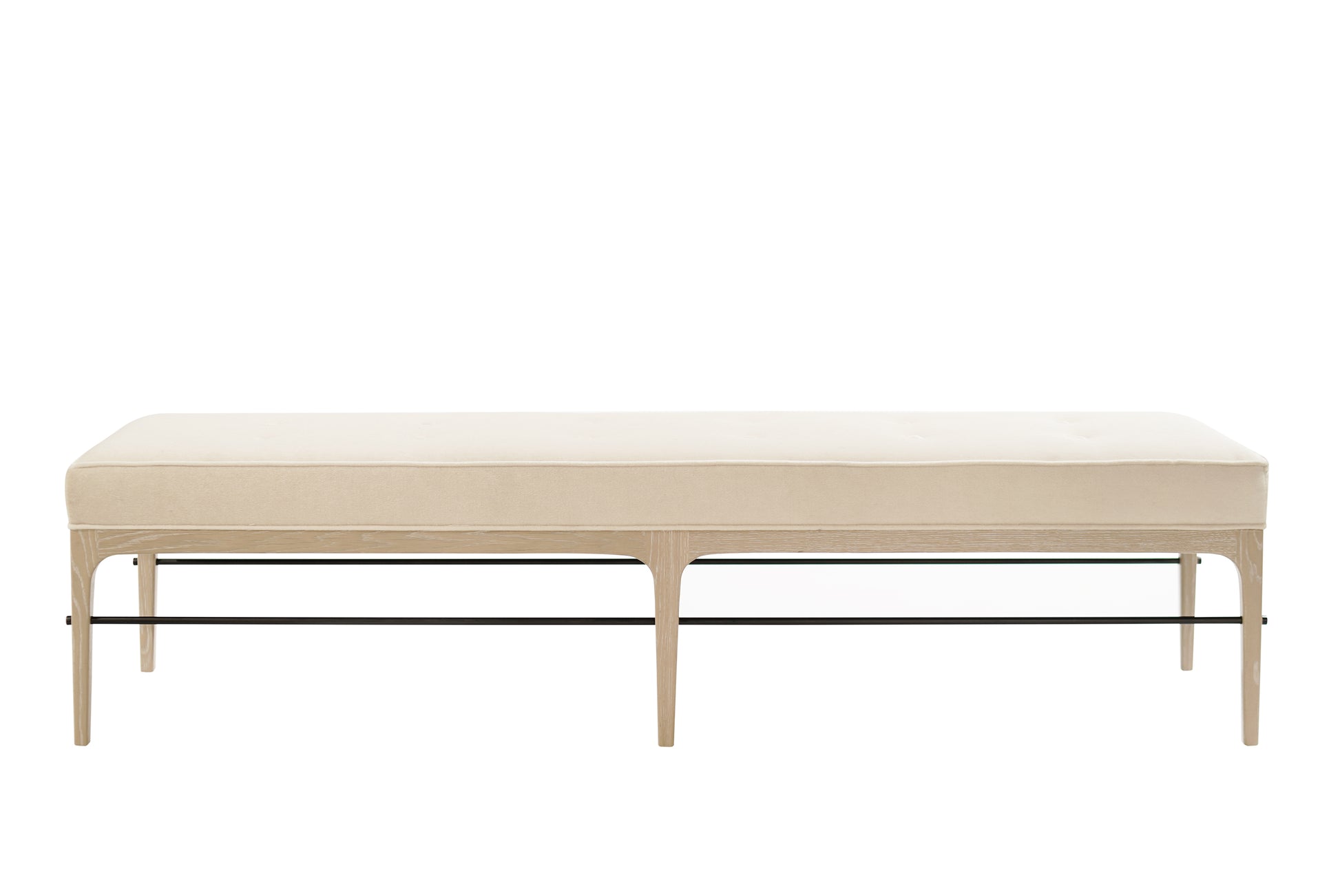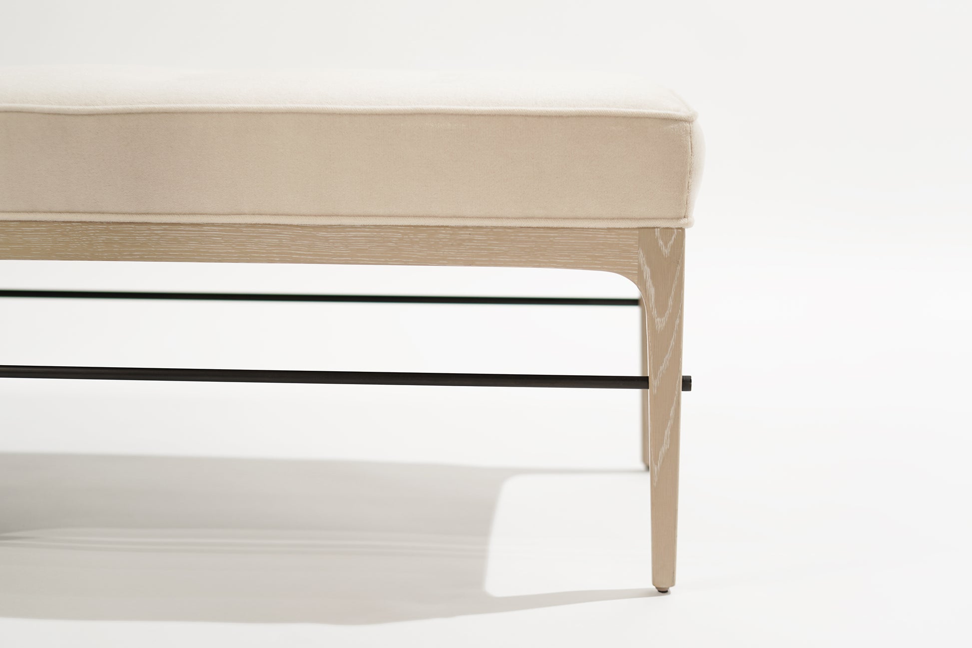 Inspired by Mid-Century Modern master Edward Wormley, "The Linear Bench" is a study in modern minimalism. Defined by its clean lines and impeccable craftsmanship, this piece features a sleek silhouette enhanced by a sturdy metal stretcher for both function and style.