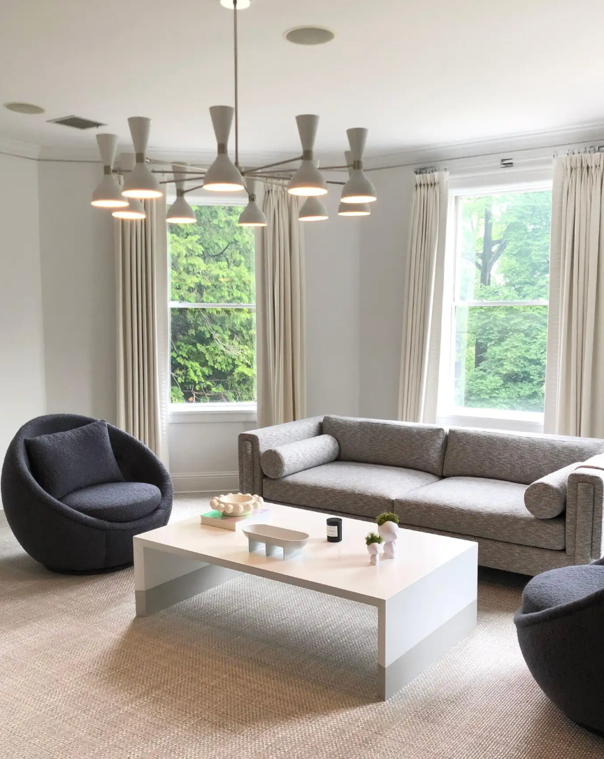 Ludo: an exercise in playful modernism. The large 10-arm round Ludo chandelier proves that good design doesn't have to be so serious! The spun aluminum shades are an iconic vintage mid-century Italian design, while the over-scaled brass band is a Blueprint Lighting hallmark that brings the design into the 21st century.