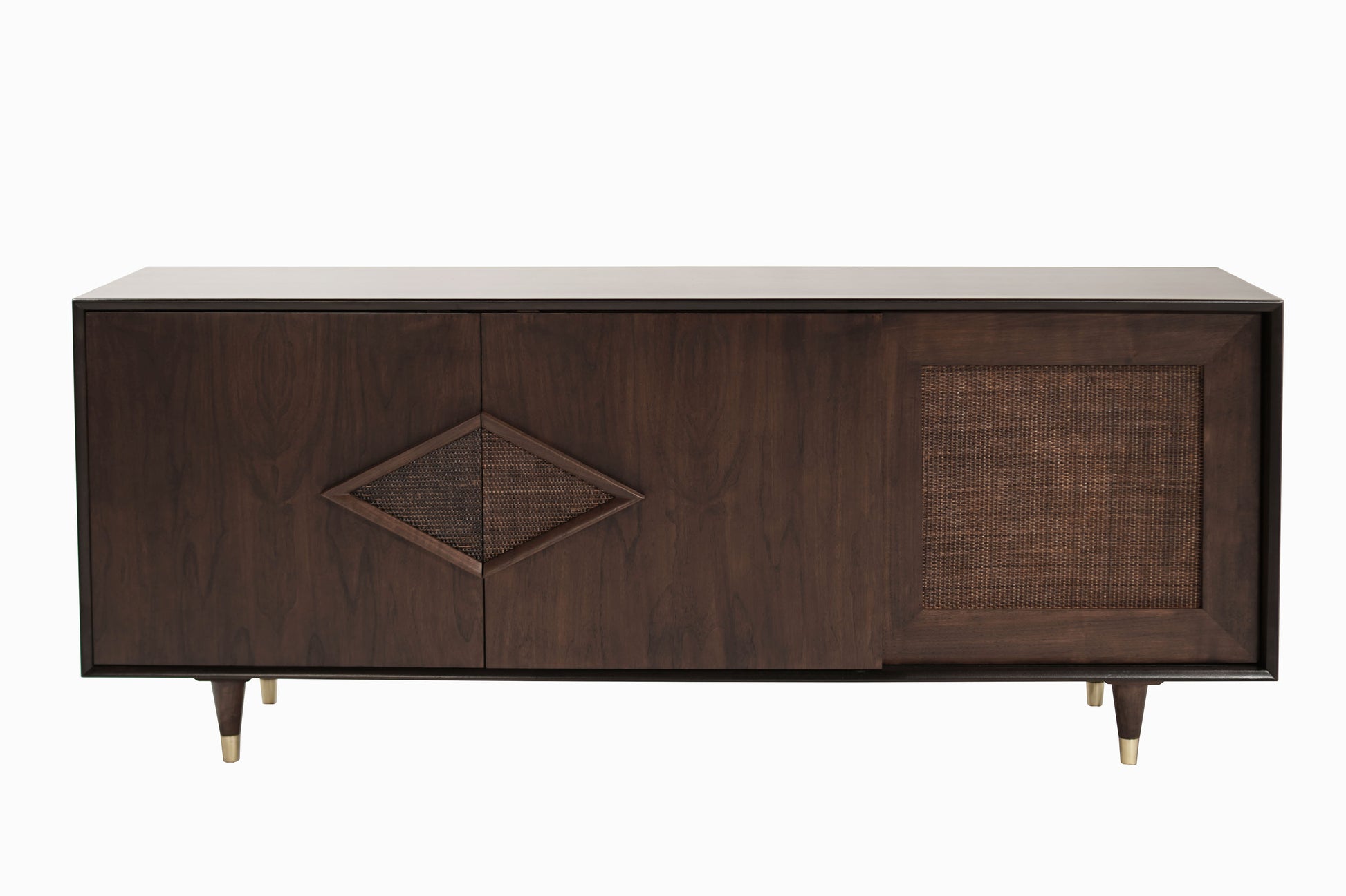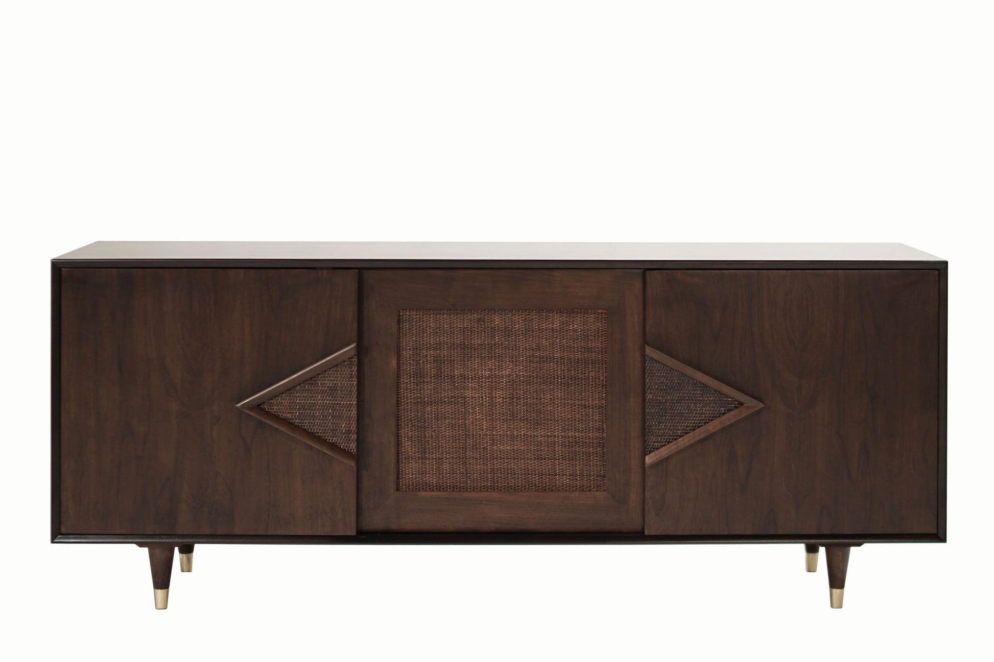 A very handsome credenza or sideboard executed in dark walnut, completely restored, circa 1950-1950. It features three sliding doors with cane details and brass sabots, each door opens up to reveal shelving, and there's also a silverware drawer in the middle.
