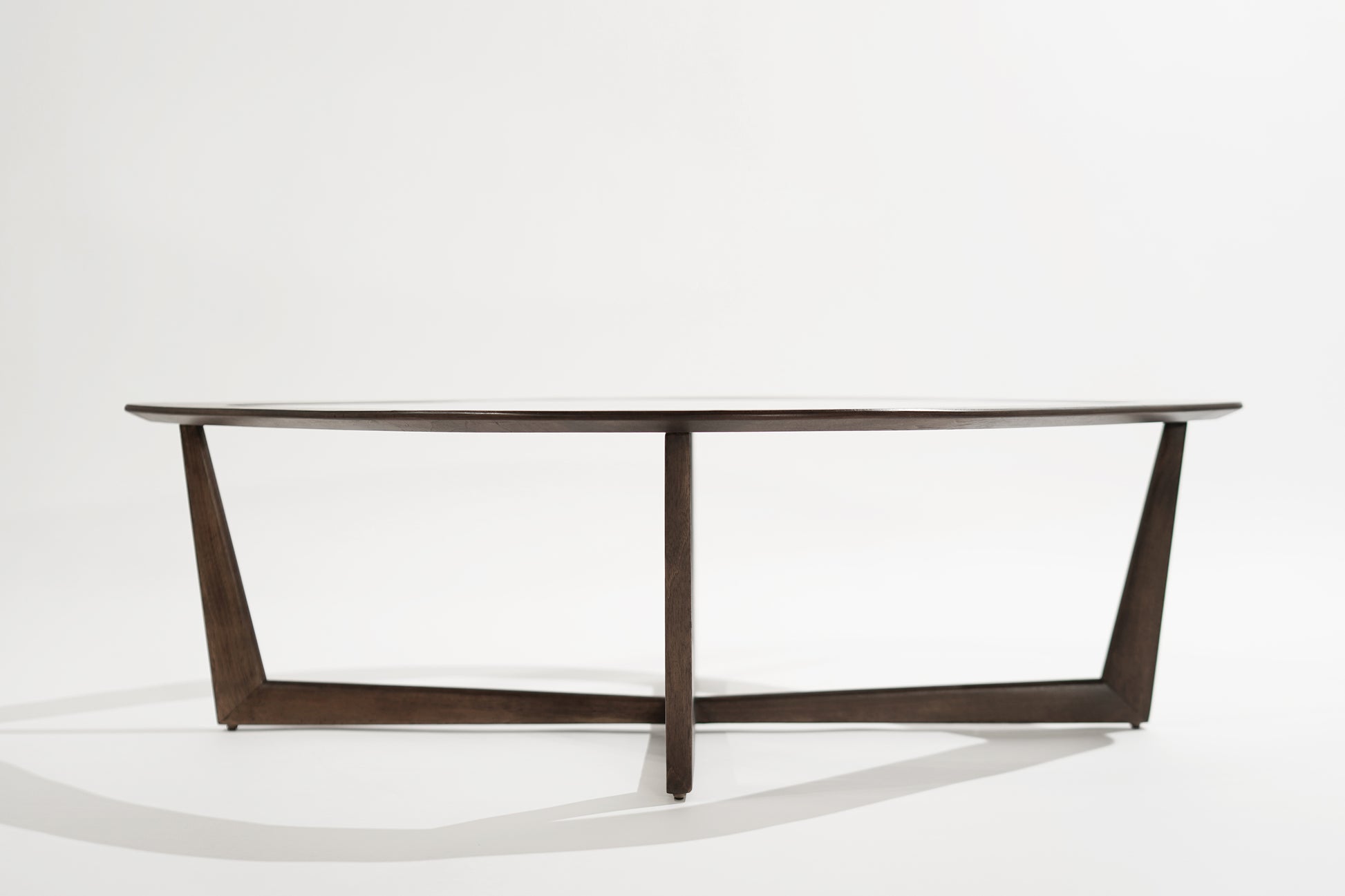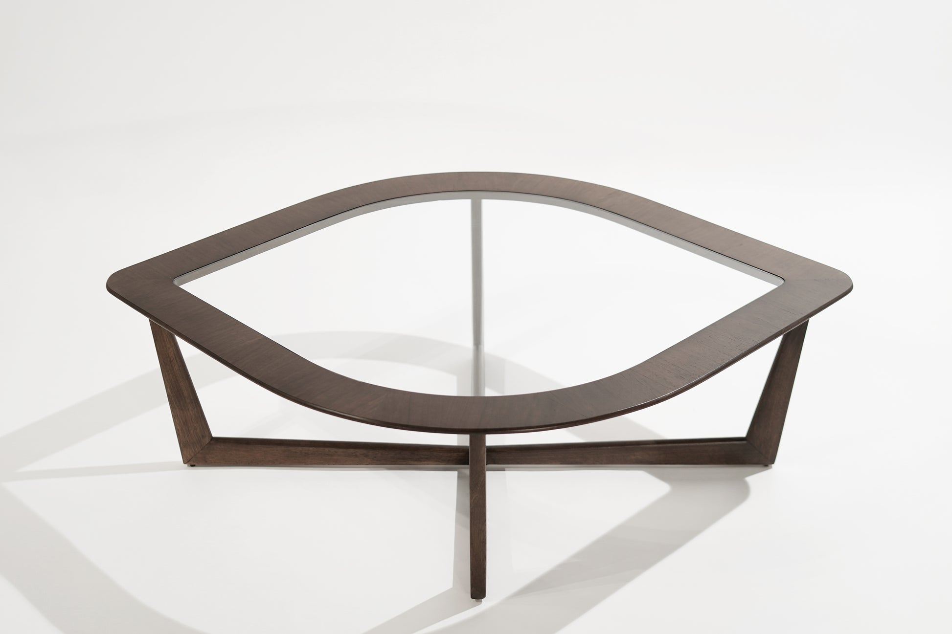 Sculptural coffee table, executed in walnut, circa 1950s. Walnut framework completely restored, new glass top.