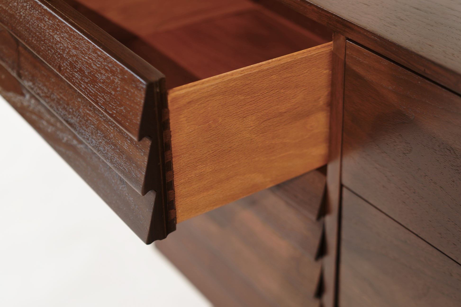 A meticulously restored mid-century modern walnut dresser by American of Martinsville. Crafted with exquisite attention to detail, this piece features lustrous brass accents that beautifully complement the rich walnut wood. With nine spacious drawers, this dresser offers ample storage space for your essentials, making it both a stunning focal point and a practical storage solution for any space.