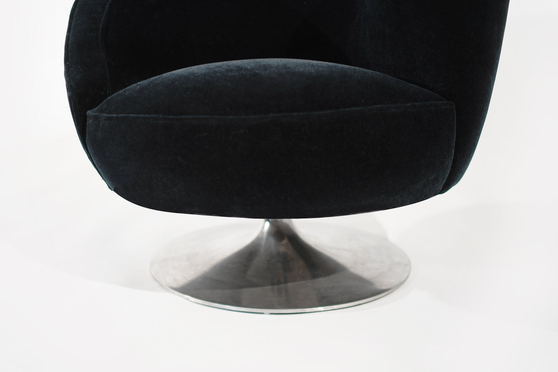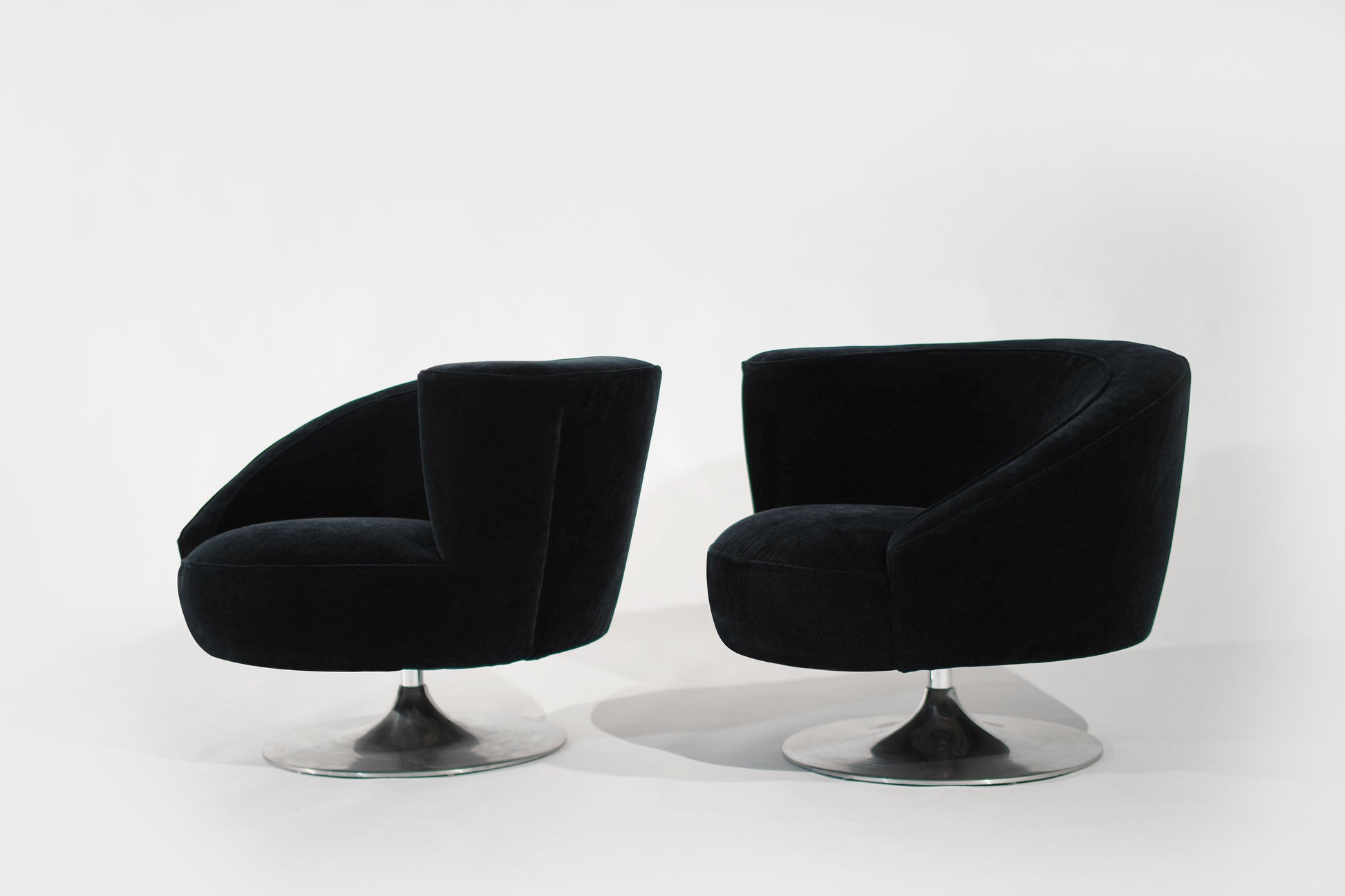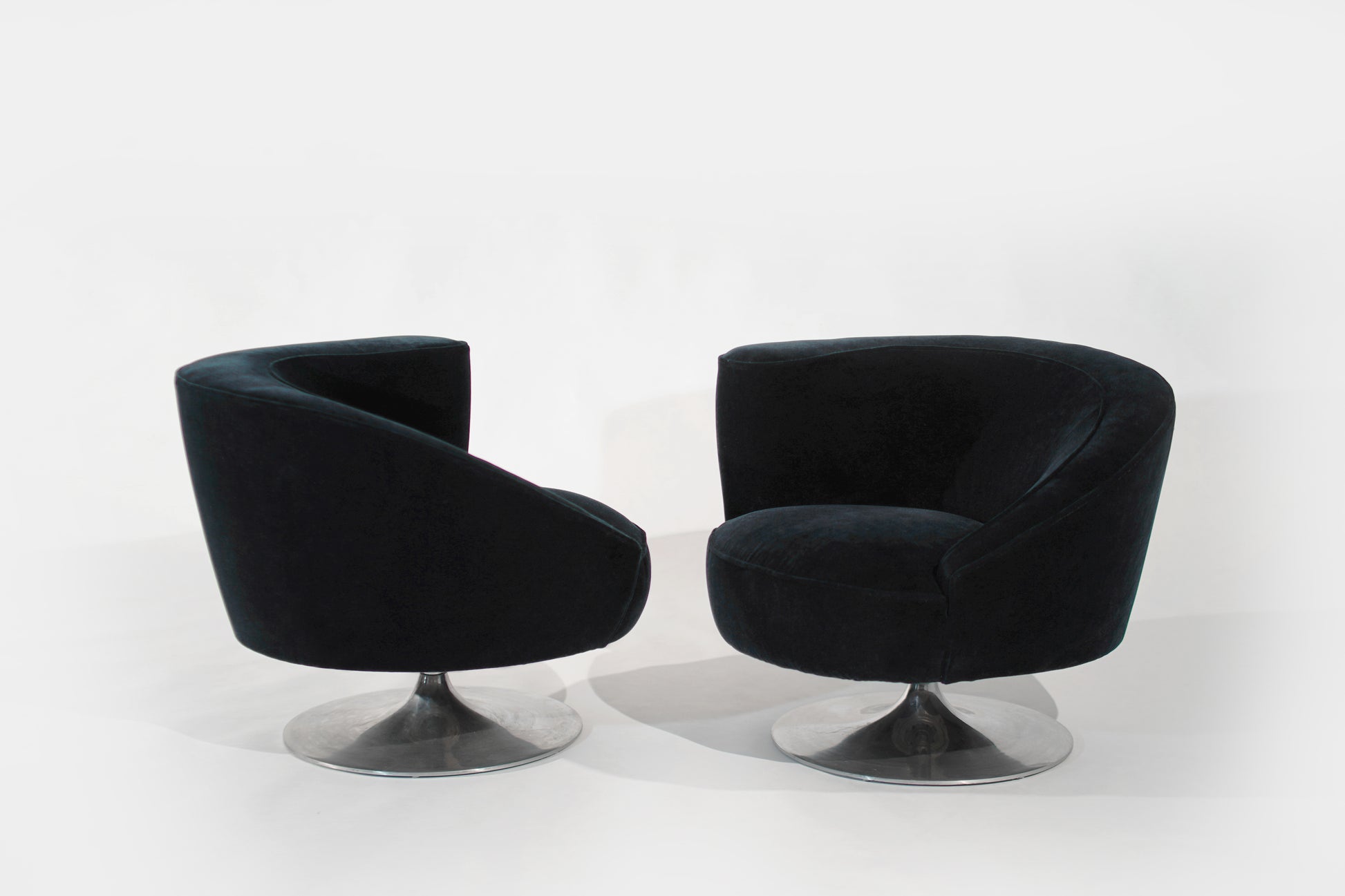 Rare pair of Corkscrew Swivel Lounge Chairs designed by Vladimir Kagan, circa 1970-1979. These chairs feature a unique corkscrew design with a swivel return system on polished steel tulip supports. They have been reupholstered in midnight blue mohair by Donghia. With their distinctive design and luxurious upholstery, these chairs are a standout addition to any space.