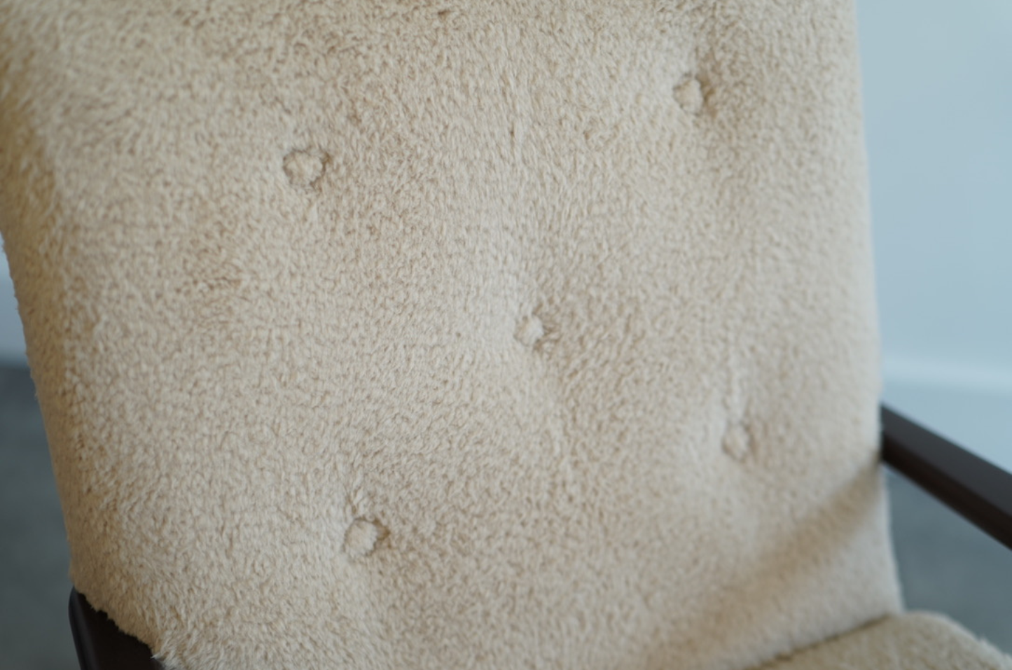 A vintage set of sculptural walnut lounge chairs, original from the 1970s. Reminiscent of George Nakashima's reverence for natural forms, the solid walnut frames have been meticulously refinished in a deep espresso tone, enhancing the grain and organic silhouette. Reupholstered in plush teddy wool, the chairs exude warmth and tactility, balancing craftsmanship with comfort. A timeless pairing of modern restraint and artisan detail.