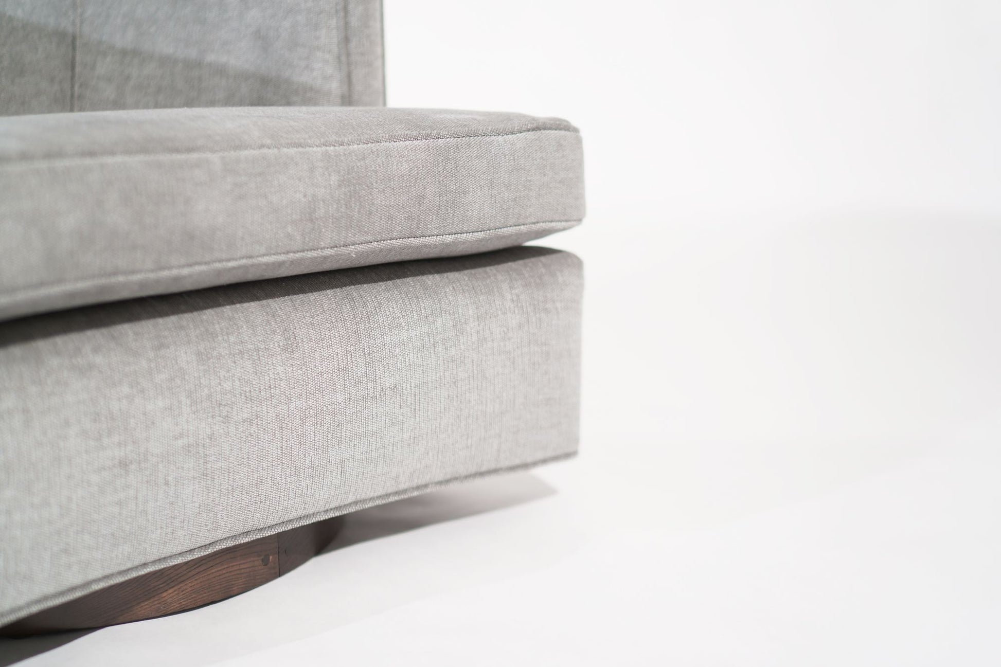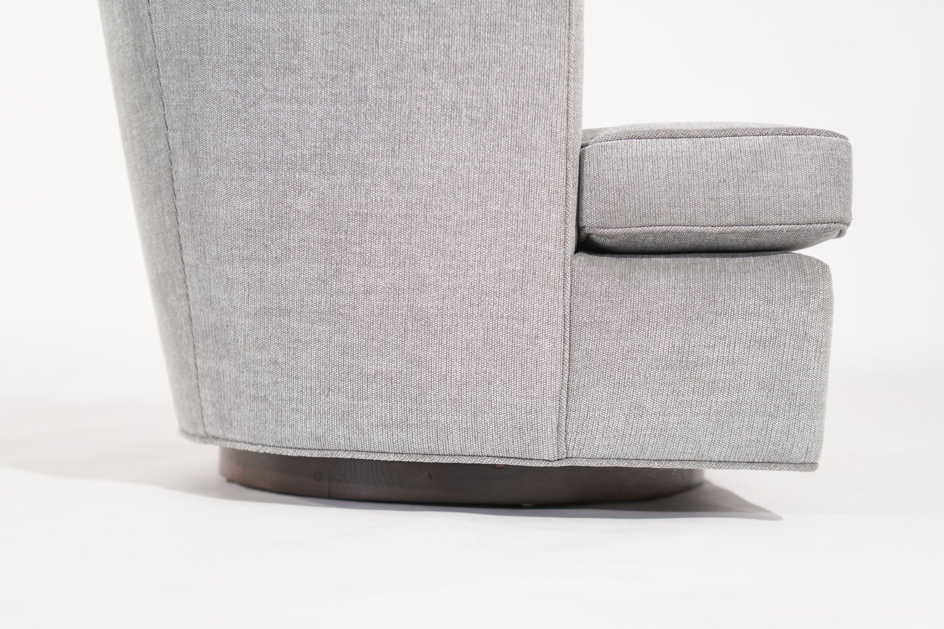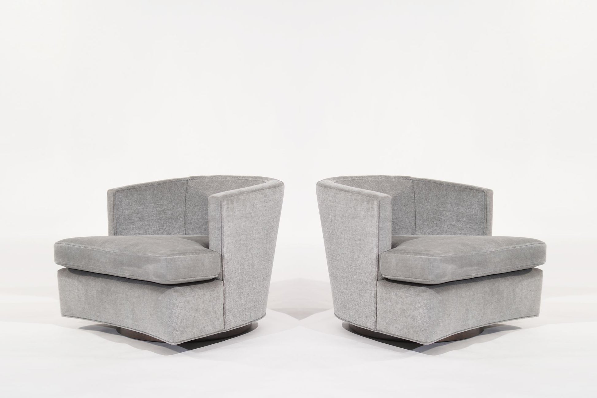 A timeless pair of swivel chairs, designed by the iconic Harvey Probber in the 1950s and brought back to life by Stamford Modern through a comprehensive restoration process. These chairs showcase the epitome of mid-century sophistication, exuding an understated elegance that seamlessly integrates into any contemporary space. Impeccably reupholstered in luxurious grey twill by Holly Hunt, the chairs not only offer a touch of modern refinement but also ensure comfort with their swiveling functionality. The distinctive concave front and low-profile silhouette add a touch of architectural flair, making them a statement piece that effortlessly combines vintage charm with contemporary sensibility.