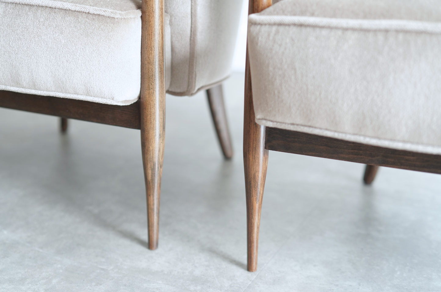 Set of vintage lounge chairs, original from the 1960s, fully restored by Stamford Modern. These striking chairs feature distinctive polished nickel arm details that contrast beautifully with the dark walnut frame. The walnut wood has been expertly refinished in a rich, dark walnut tone, enhancing its natural grain. Reupholstered in luxurious mohair, the chairs offer both comfort and style—showcasing a seamless blend of timeless craftsmanship and refined materials.