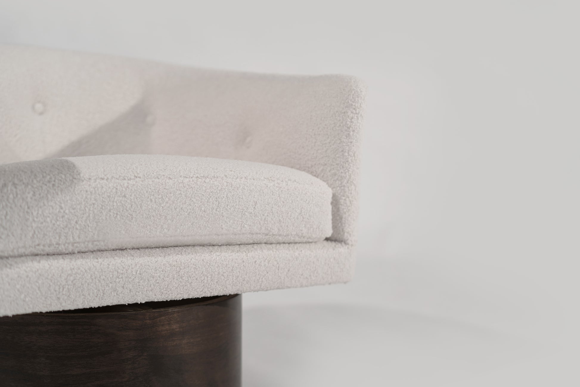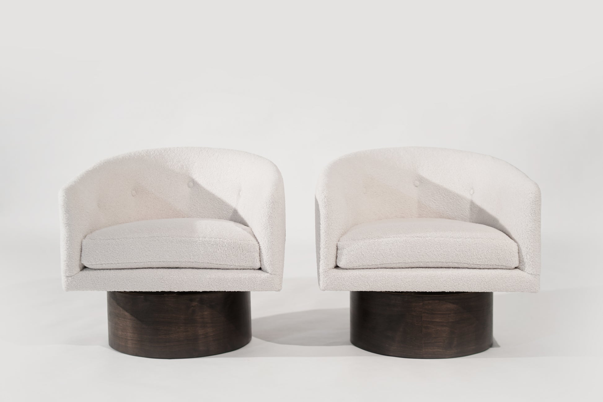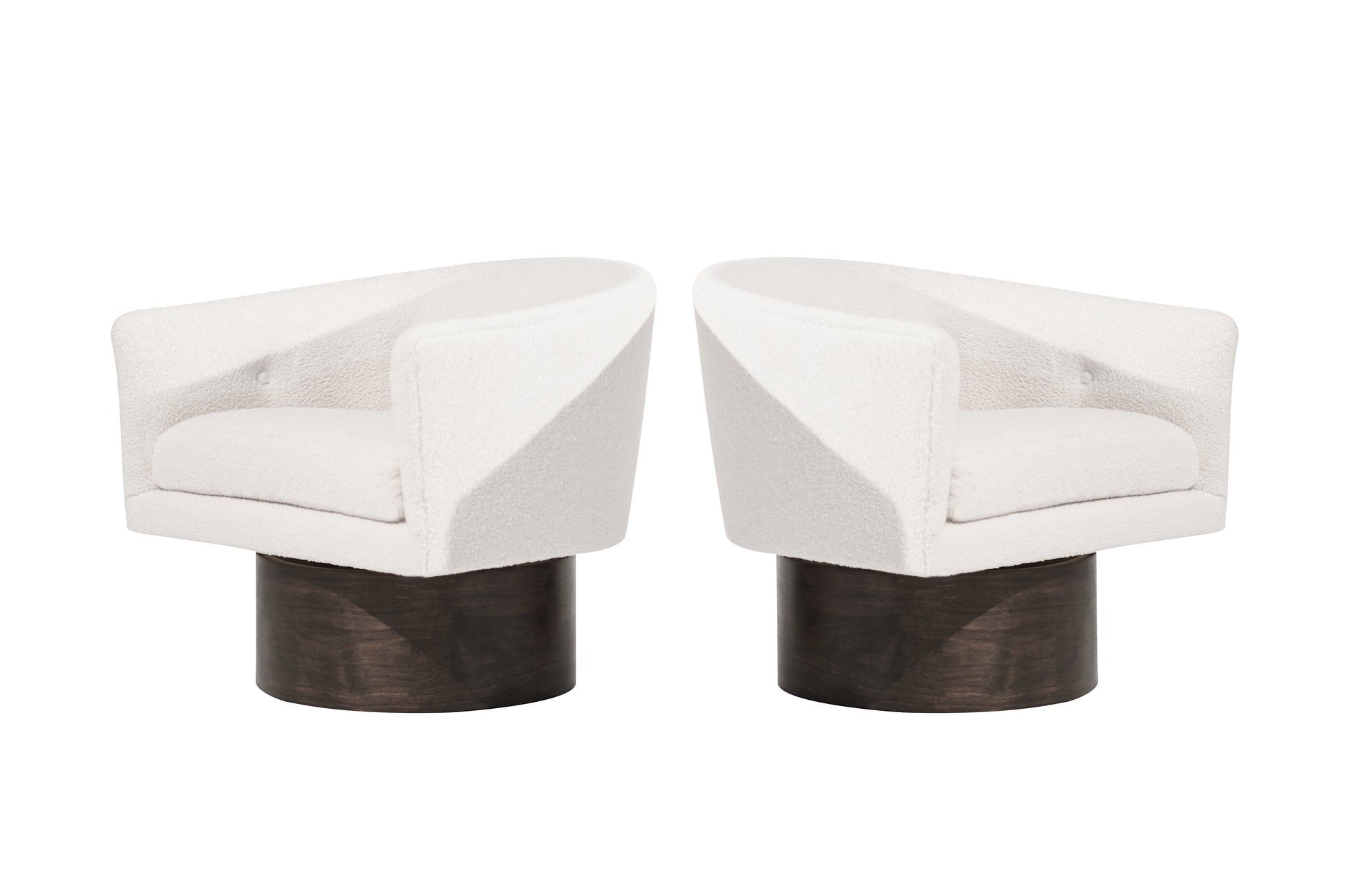 A stunning set of vintage swivel chairs by Milo Baughman for Thayer Coggin, circa 1970s. These chairs are fully restored and reupholstered in luxurious off-white boucle, perfectly complementing the sleek walnut supports. A timeless blend of comfort and style, ideal for any modern space.