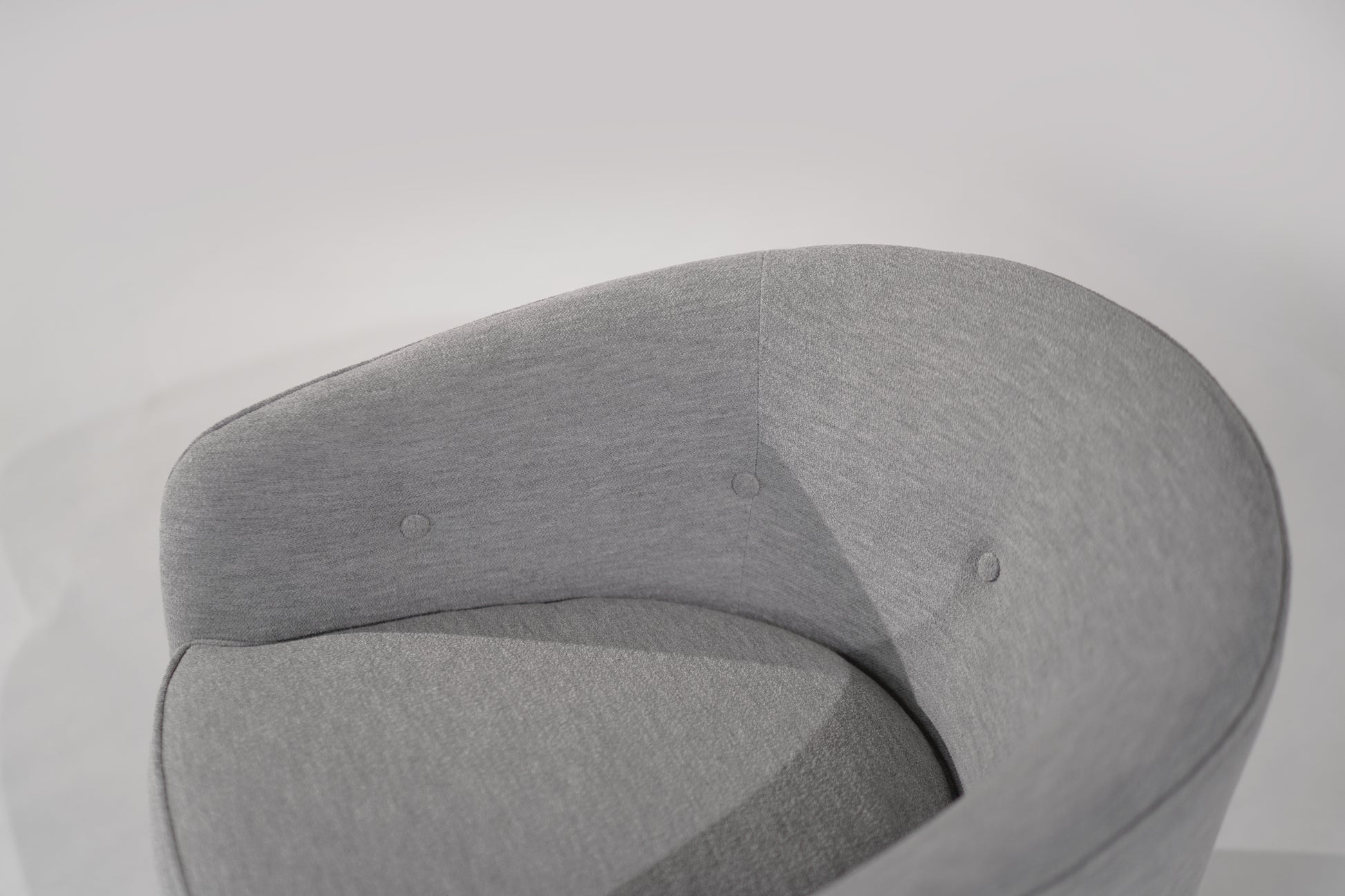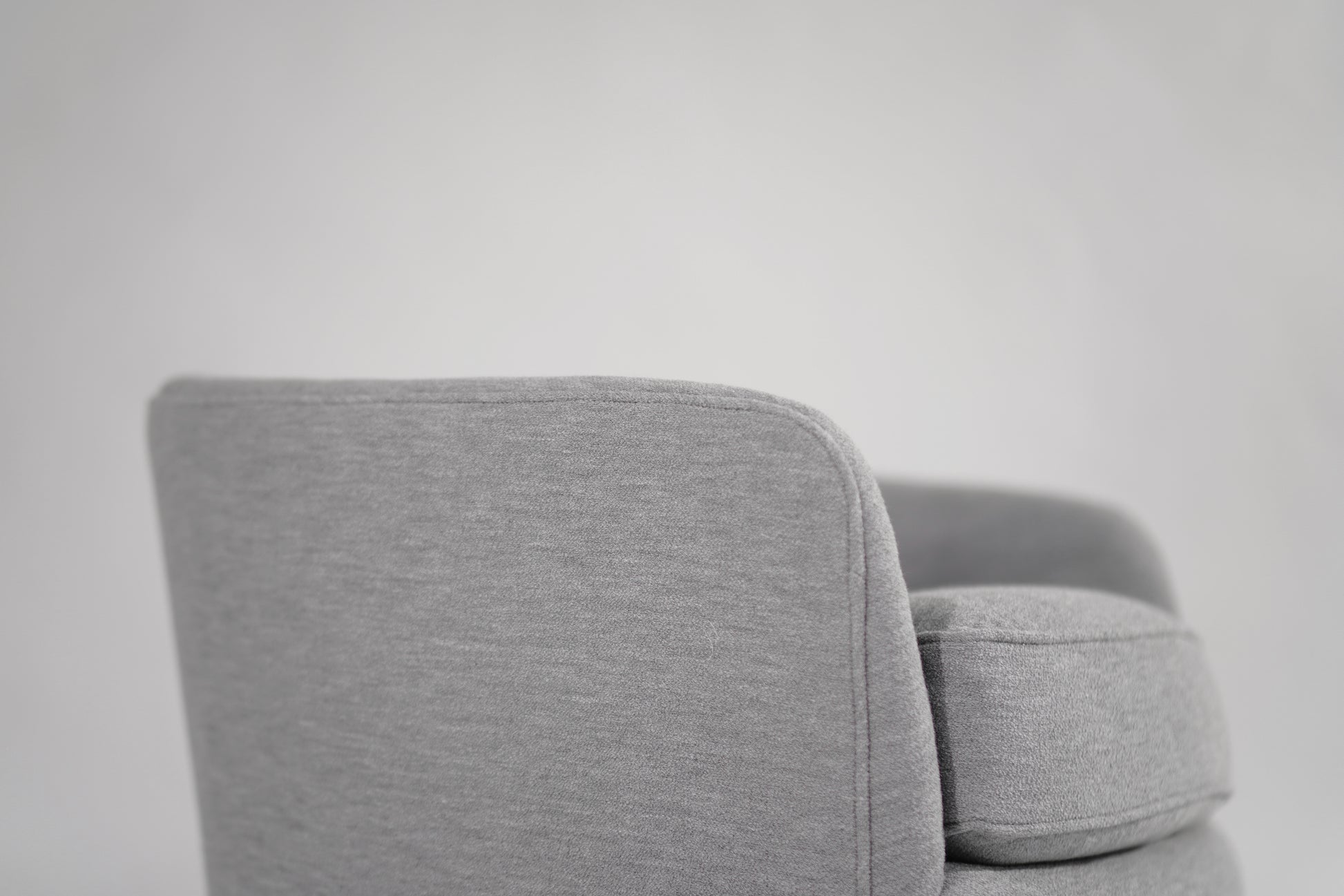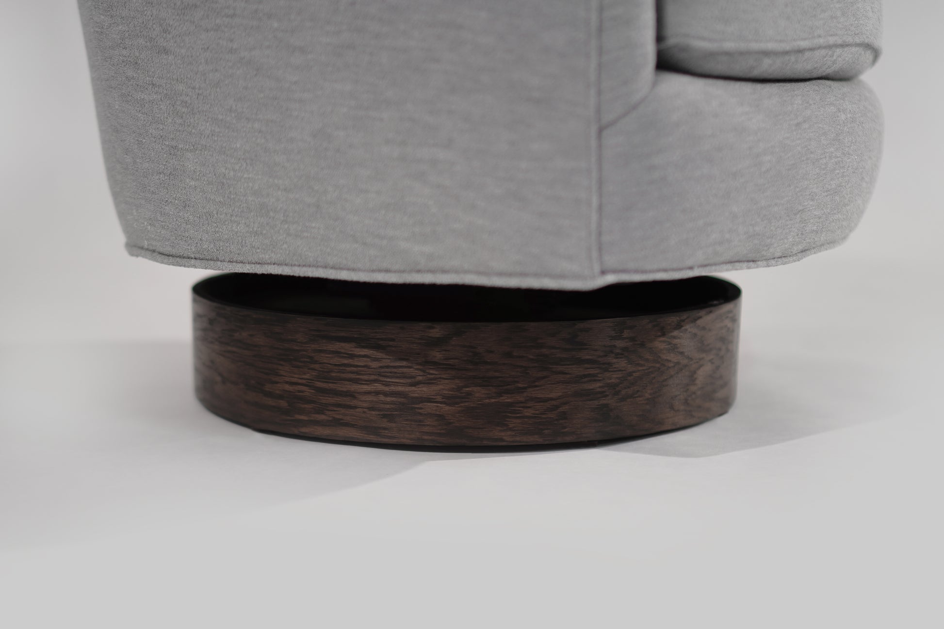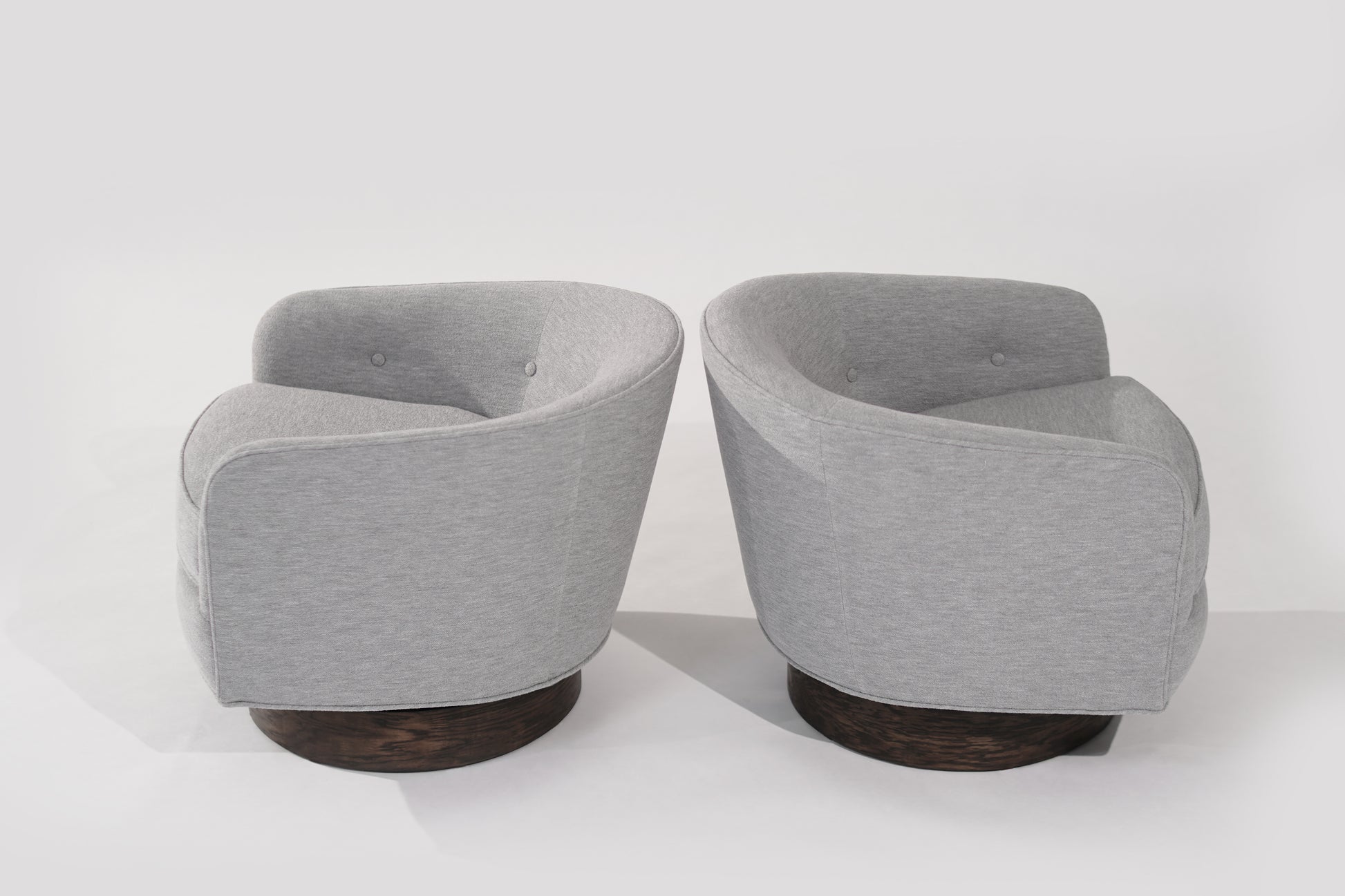Step back in time with our vintage swivel tilt lounge chairs, circa 1960-1969, now reborn in chic gray bouclé upholstery. Fully restored oak swivel bases ensure durability and style. Experience the perfect fusion of mid-century charm and modern comfort. Ideal for any space seeking timeless elegance and relaxation.