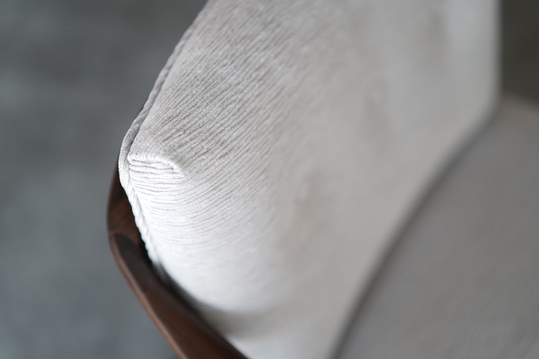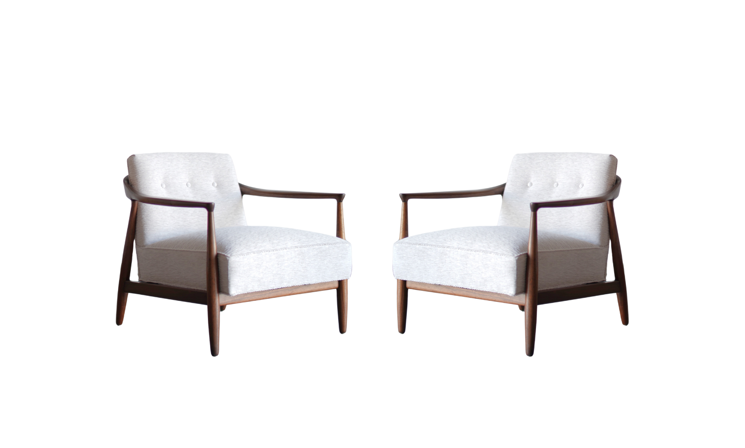 A stunning set of sculptural walnut lounge chairs by Erwin Lambeth, circa 1950s. Expertly restored to highlight the elegant curves of the walnut frames, these chairs have been reupholstered in luxurious off-white chenille, blending timeless design with modern sophistication. Perfect for adding a touch of Mid-Century Modern charm to any living space.