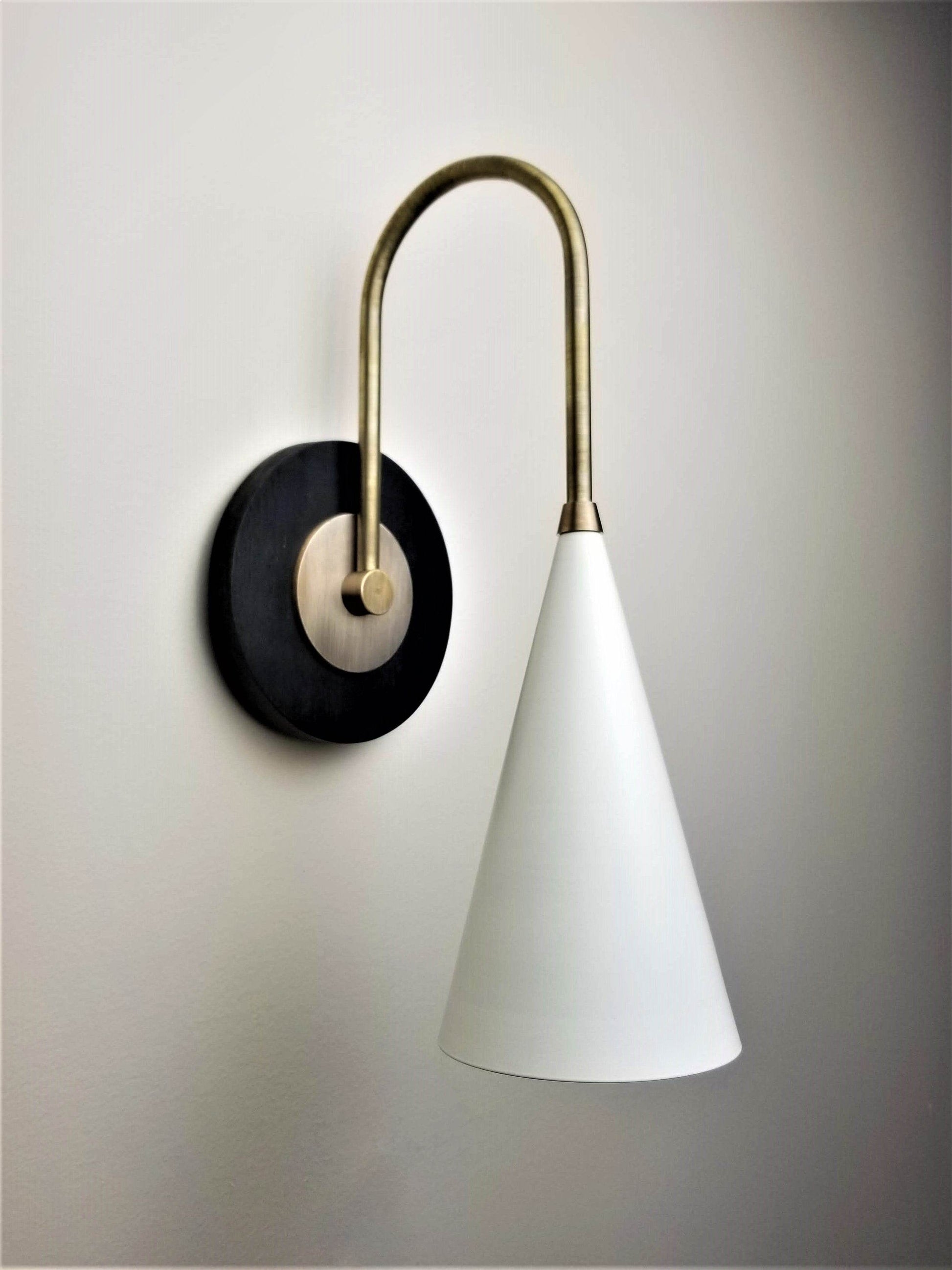 The Solana Wall Mount Lamp is shown in our Natural Brass and Perfect White enamel. The walnut back plate (available in natural or ebonized stains) and distinctly architectural brass fittings make the Solana a strong design statement and a lovely study in mixed materials. This design is strongly influenced by Scandinavian, Danish, French, and Italian Mid-Century Modernism.