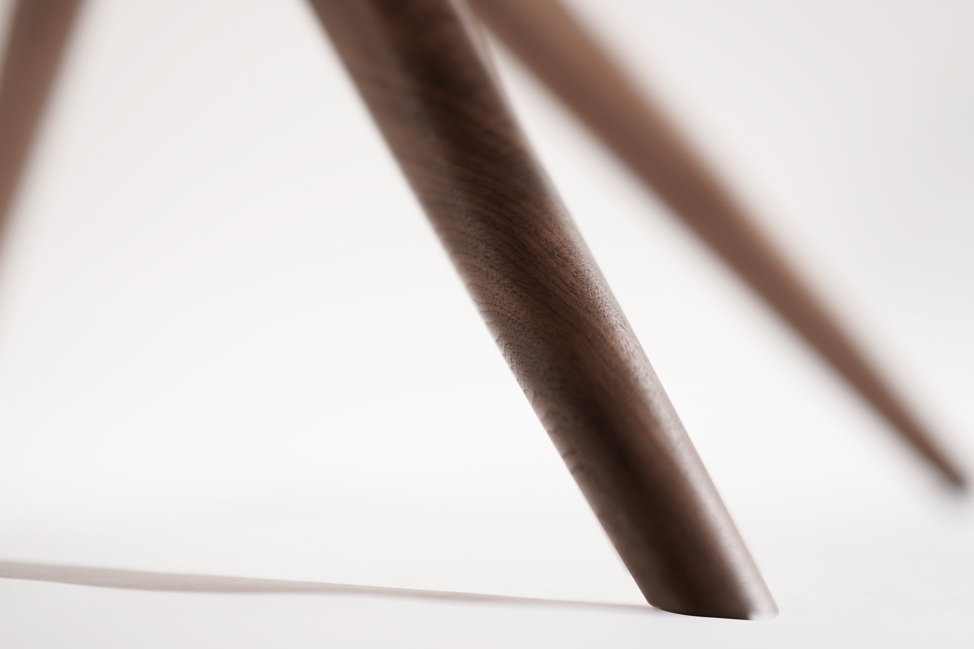 The Gazelle Dining Table seamlessly combines demure curves with unexpected sharpness, resulting in a captivating piece. Crafted from solid walnut, this table boasts a lightweight aesthetic while maintaining incredible strength, thanks to its meticulously hand-sculpted legs. The round tabletop features sloping edges, embracing a natural approach to modernism. Adding a touch of opulence, a small brass "spear-tip" gleams at the center, paying homage to the iconic Italian furniture designer Gio Ponti and infusing the table with timeless sophistication.