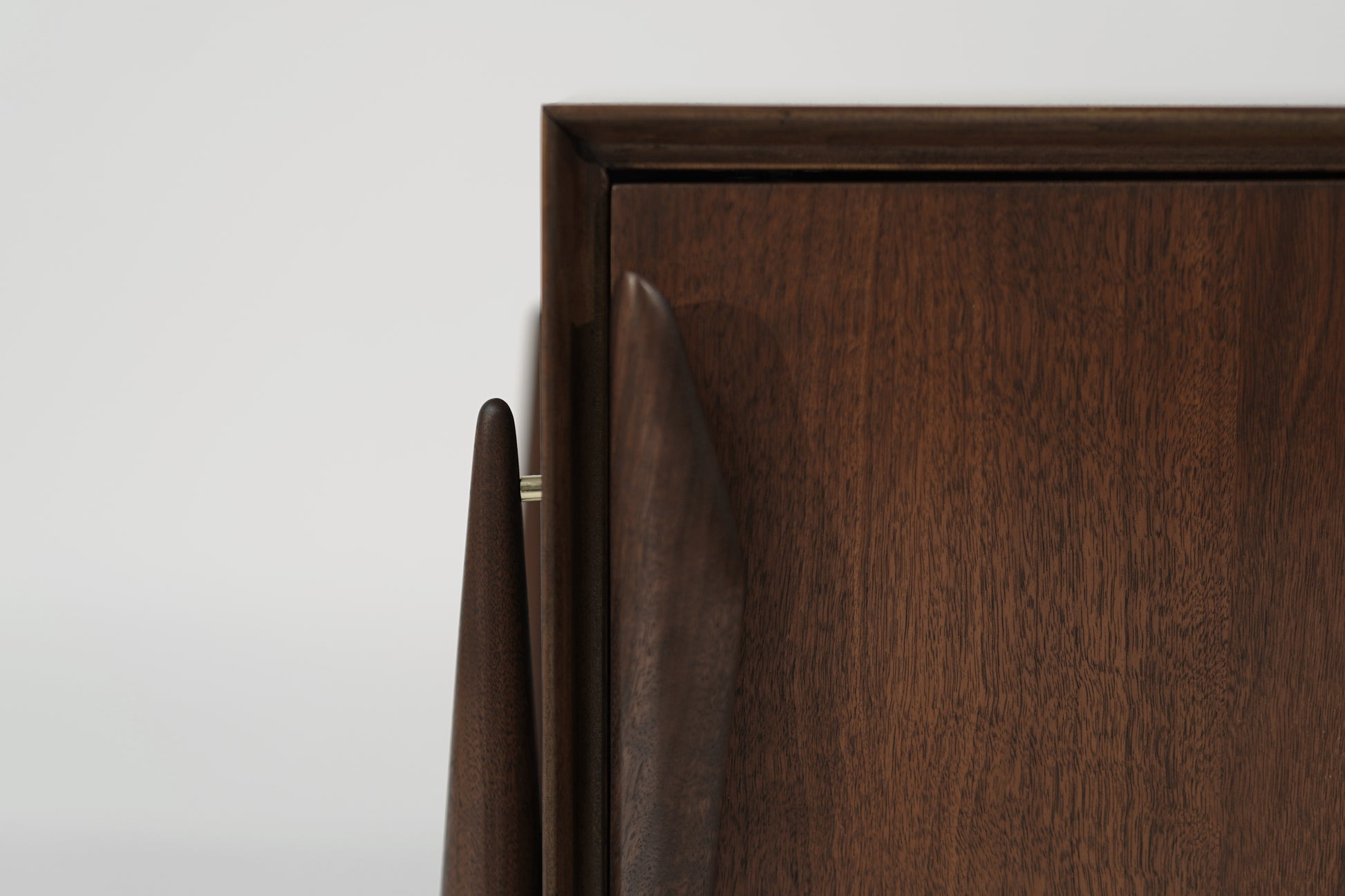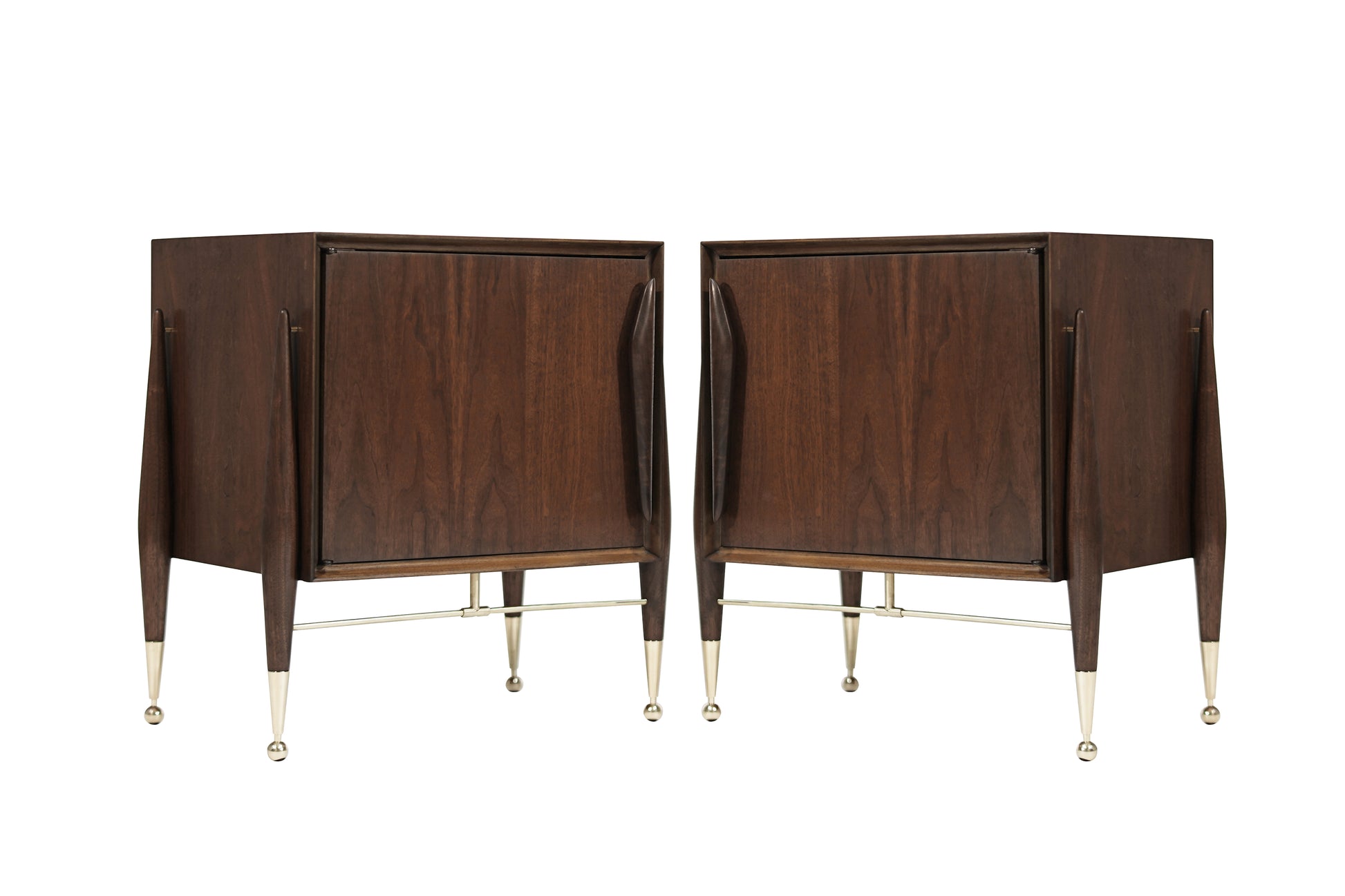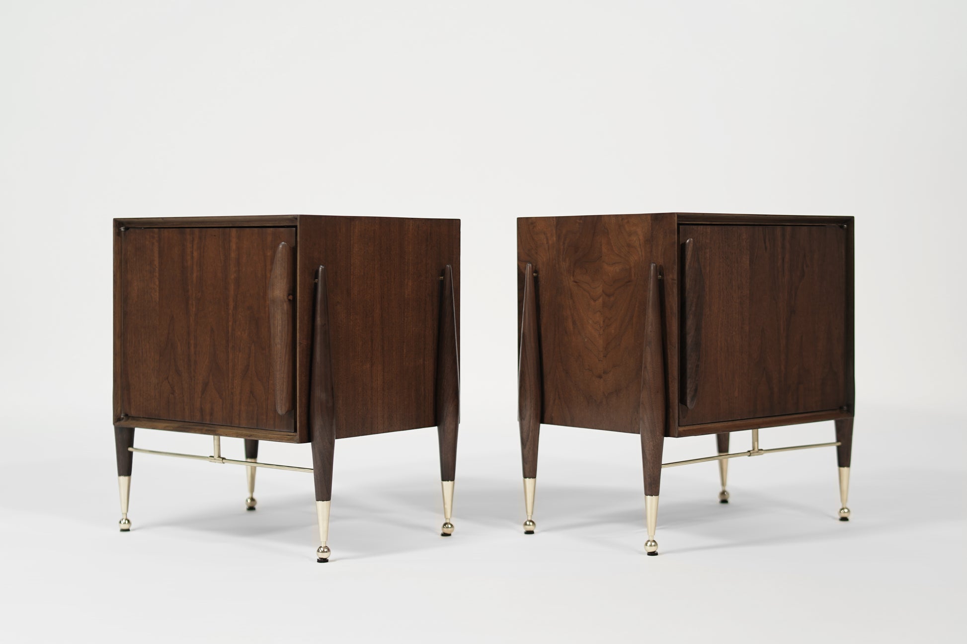 A stunning set of walnut and brass end tables by Kent Coffey, circa 1950s, meticulously restored by Stamford Modern. Featuring sculpted drawer pulls, each door opens to reveal elegant glass shelving, offering both style and functional storage. The warm walnut finish and brass accents embody timeless Mid-Century Modern design, perfect for elevating any space.