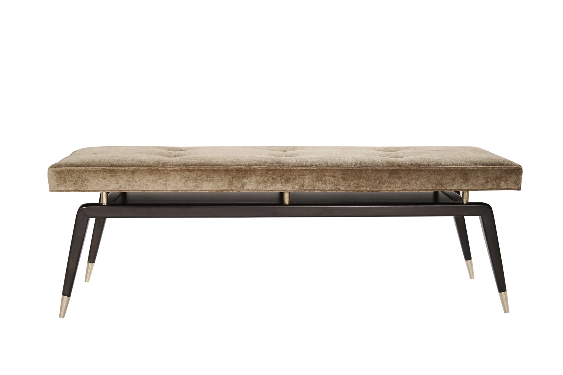 The Gio Bench by Stamford Modern: a perfect blend of Gio Ponti's timeless design and modern functionality. This elegant bench features signature angled legs with metal sabots for added stability and longevity. The upholstered cushion, elevated by metal risers, offers both refined elegance and structural integrity.