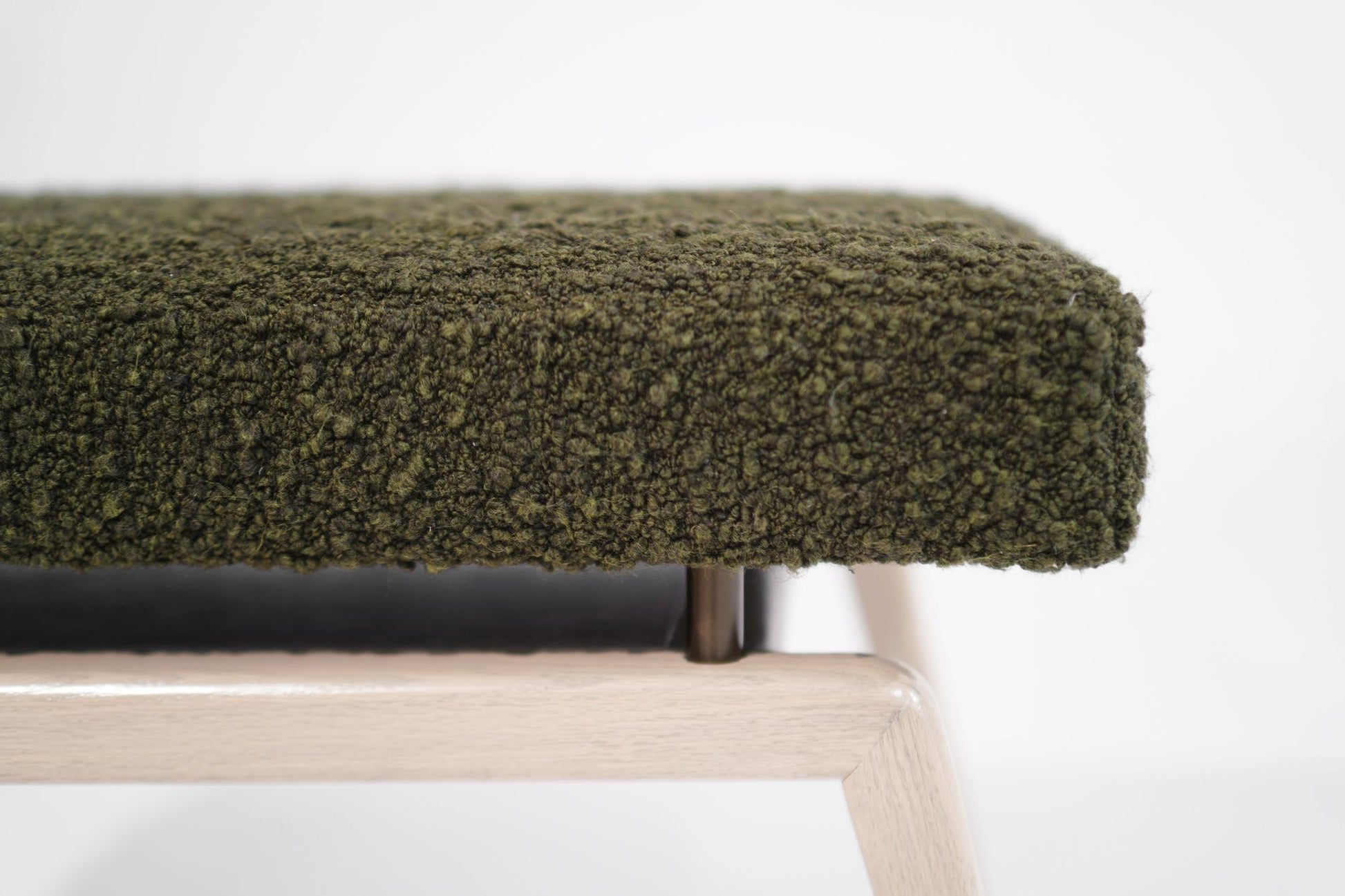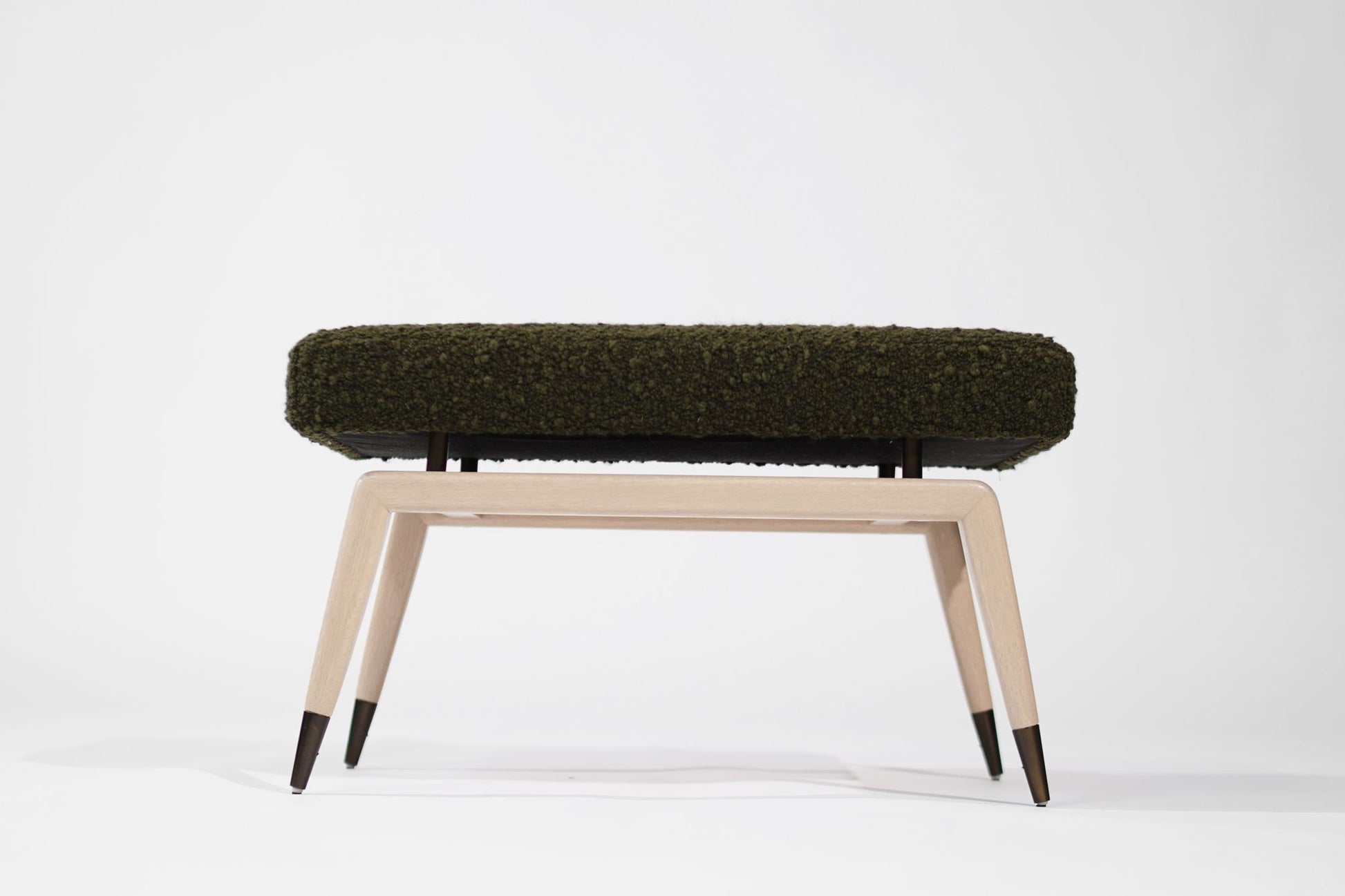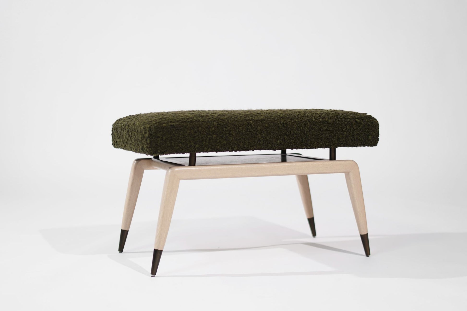 The Gio Bench by Stamford Modern: a perfect blend of Gio Ponti's timeless design and modern functionality. This elegant bench features signature angled legs with metal sabots for added stability and longevity. The upholstered cushion, elevated by metal risers, offers both refined elegance and structural integrity.