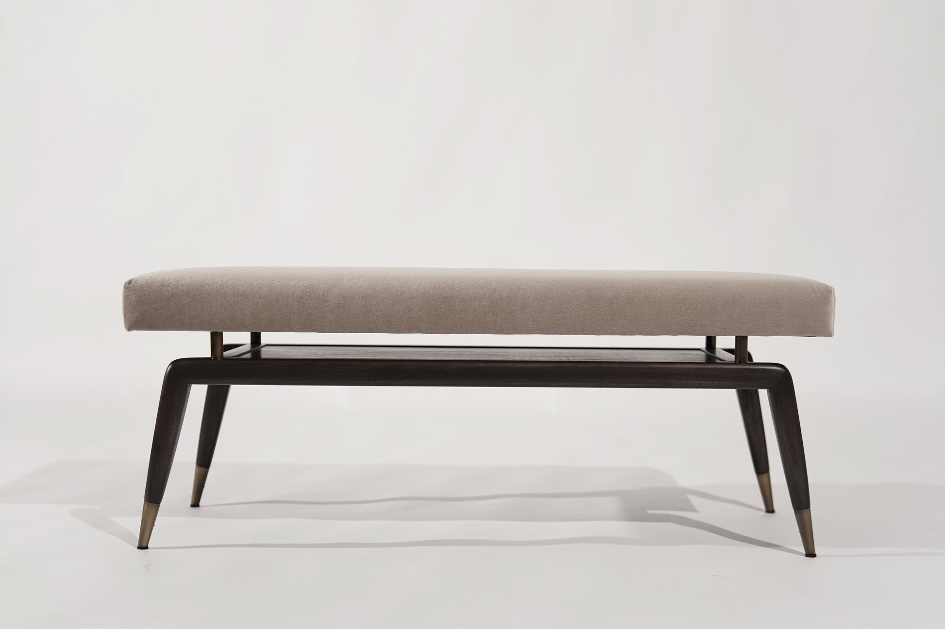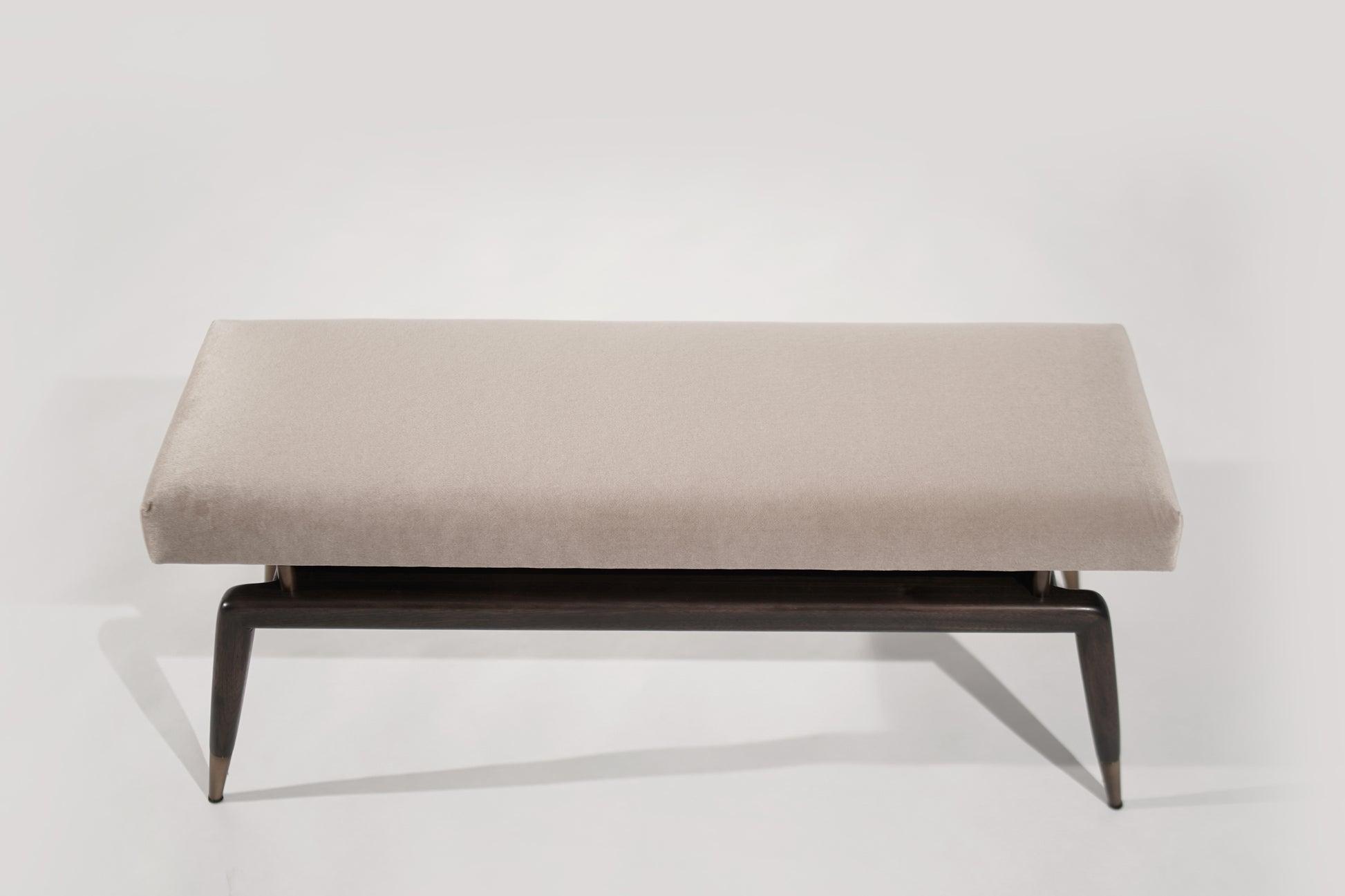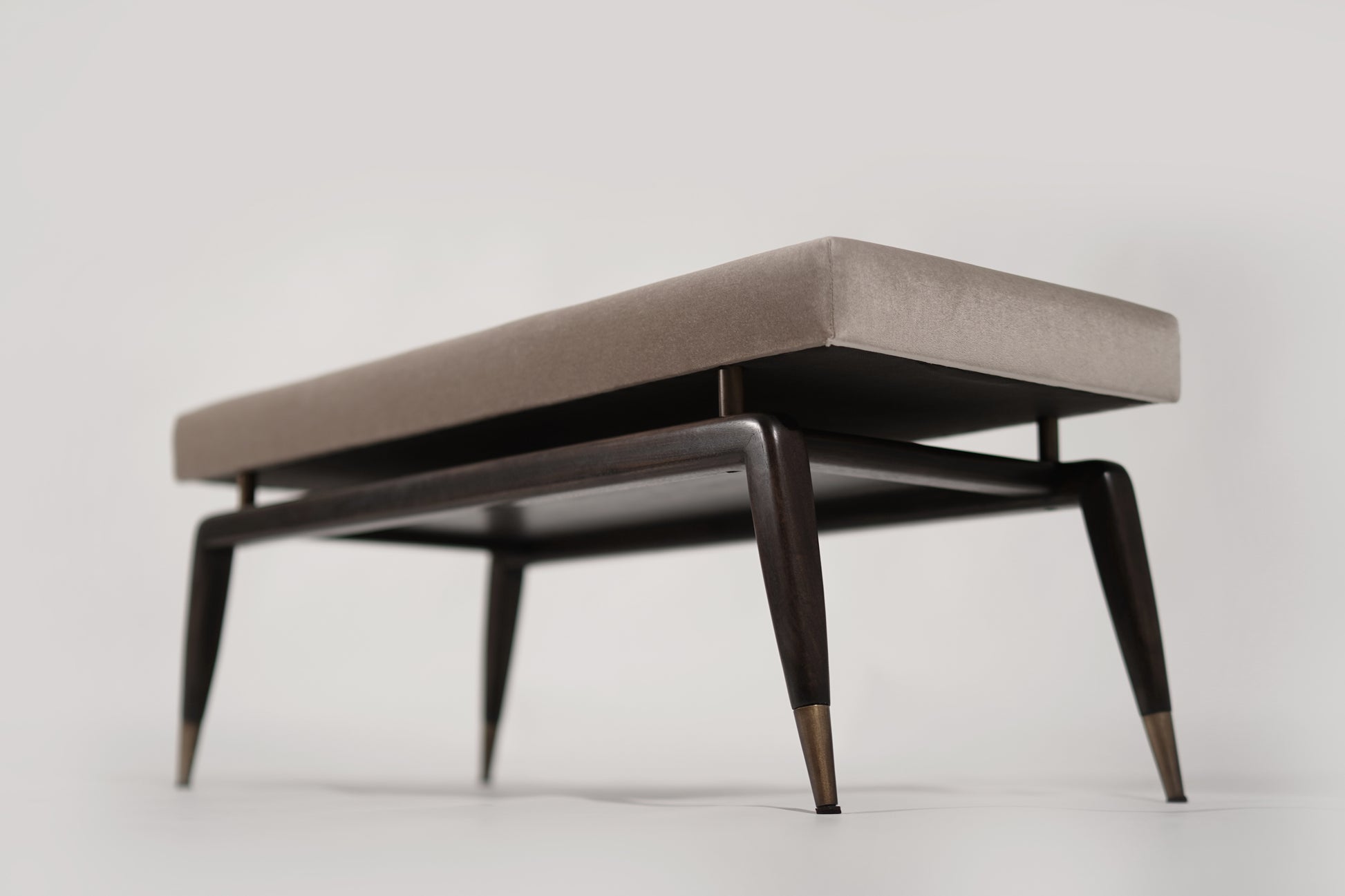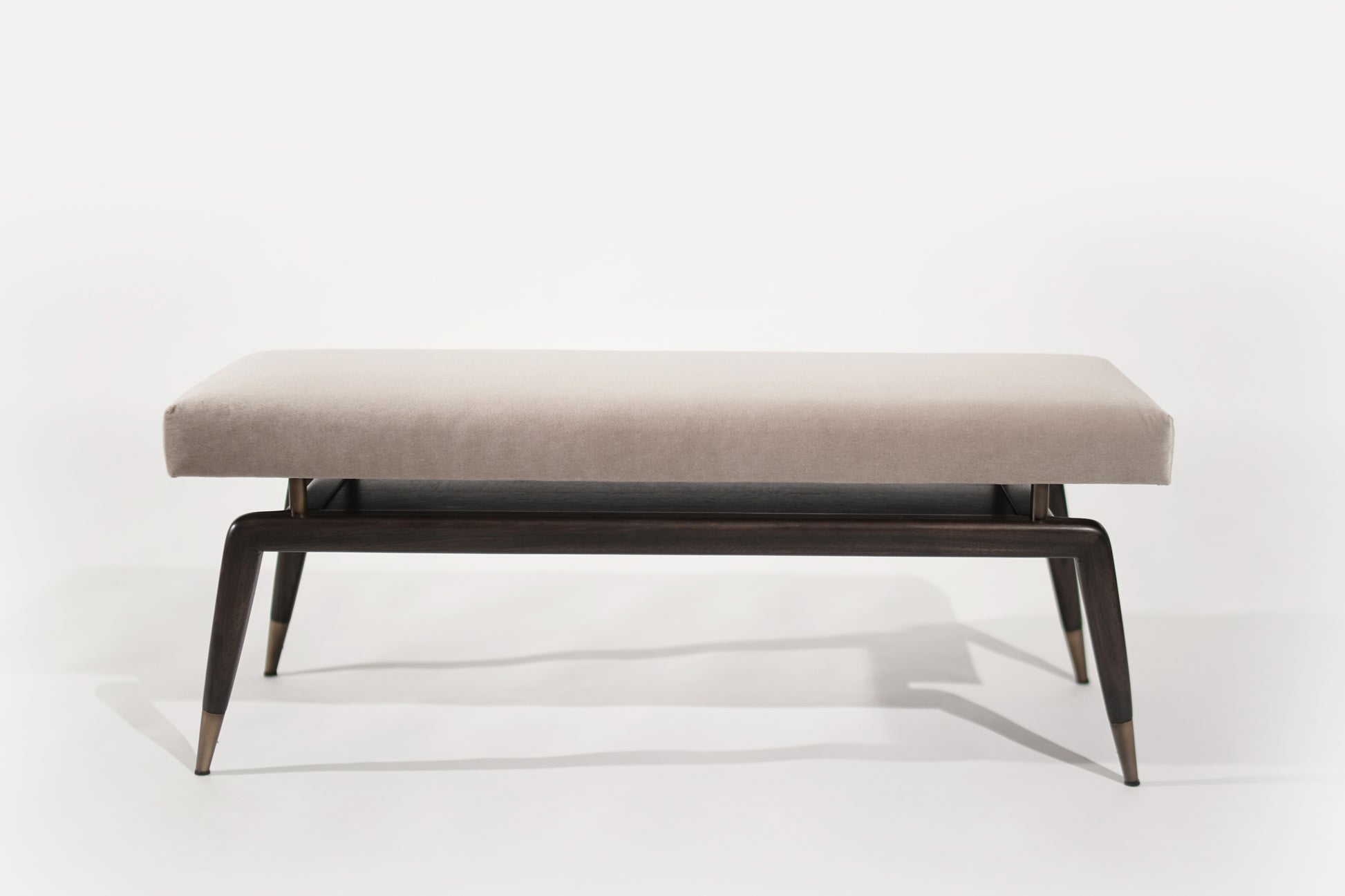 The Gio Bench by Stamford Modern: a perfect blend of Gio Ponti's timeless design and modern functionality. This elegant bench features signature angled legs with metal sabots for added stability and longevity. The upholstered cushion, elevated by metal risers, offers both refined elegance and structural integrity.