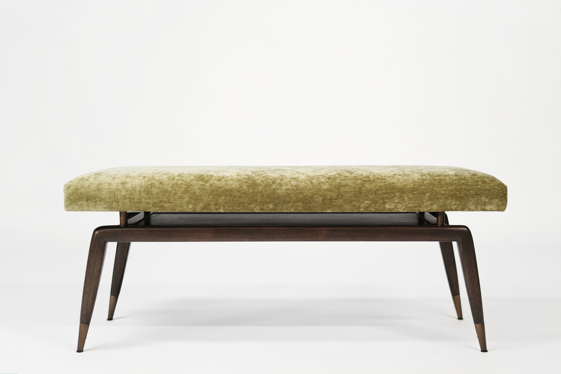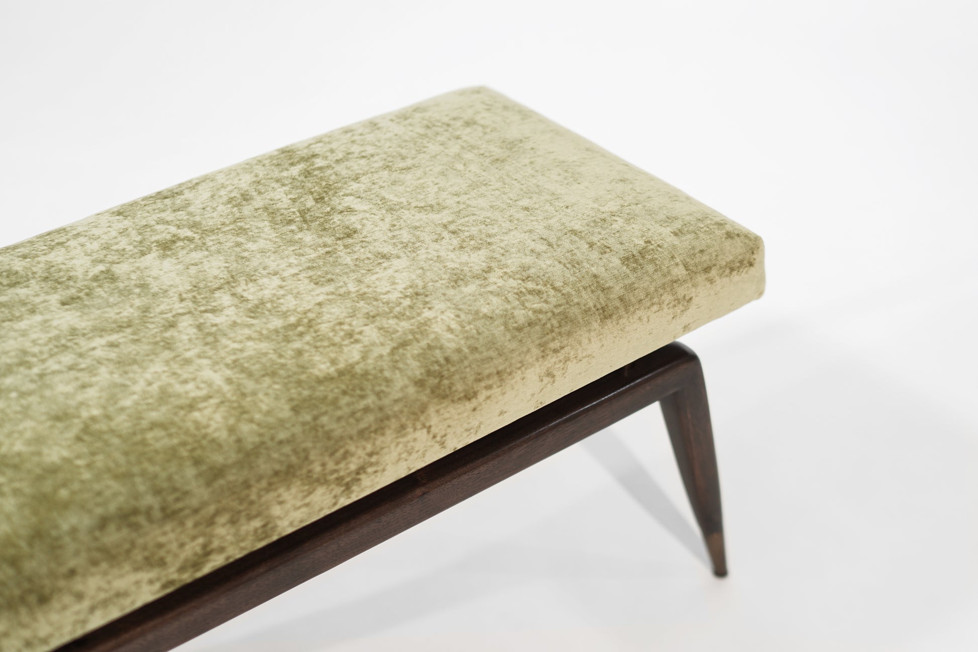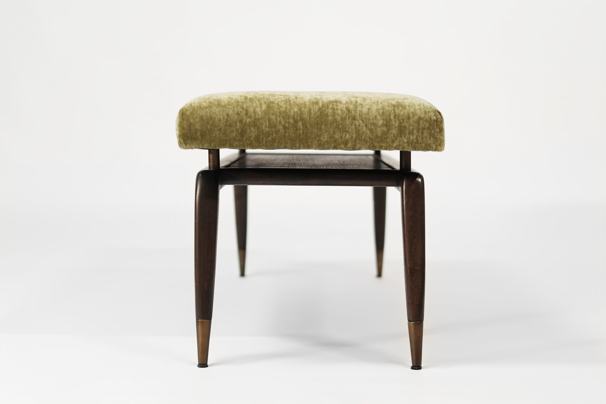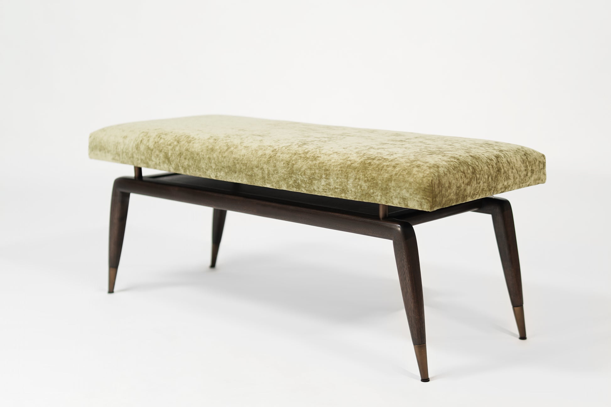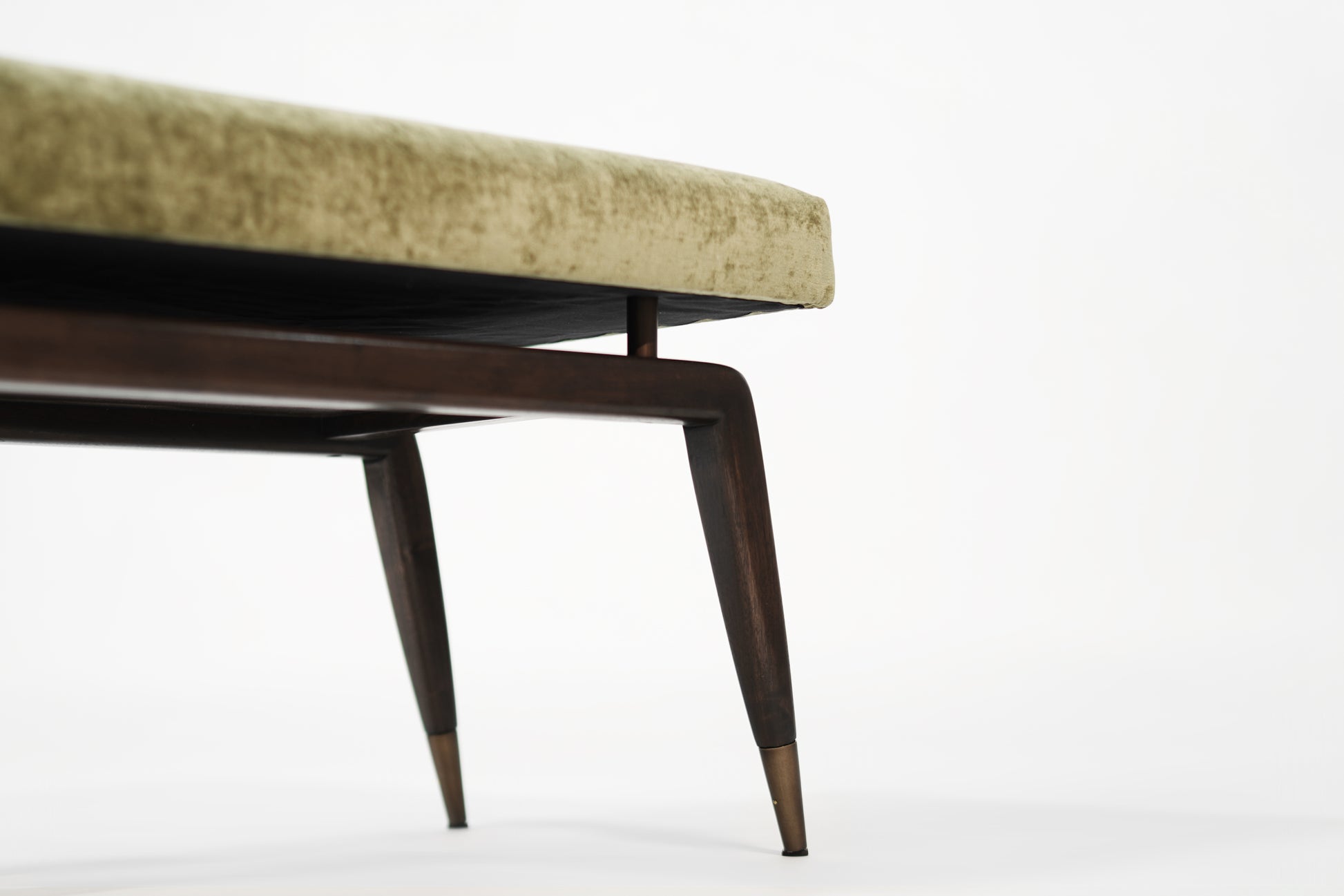 The Gio Bench by Stamford Modern: a perfect blend of Gio Ponti's timeless design and modern functionality. This elegant bench features signature angled legs with metal sabots for added stability and longevity. The upholstered cushion, elevated by metal risers, offers both refined elegance and structural integrity.