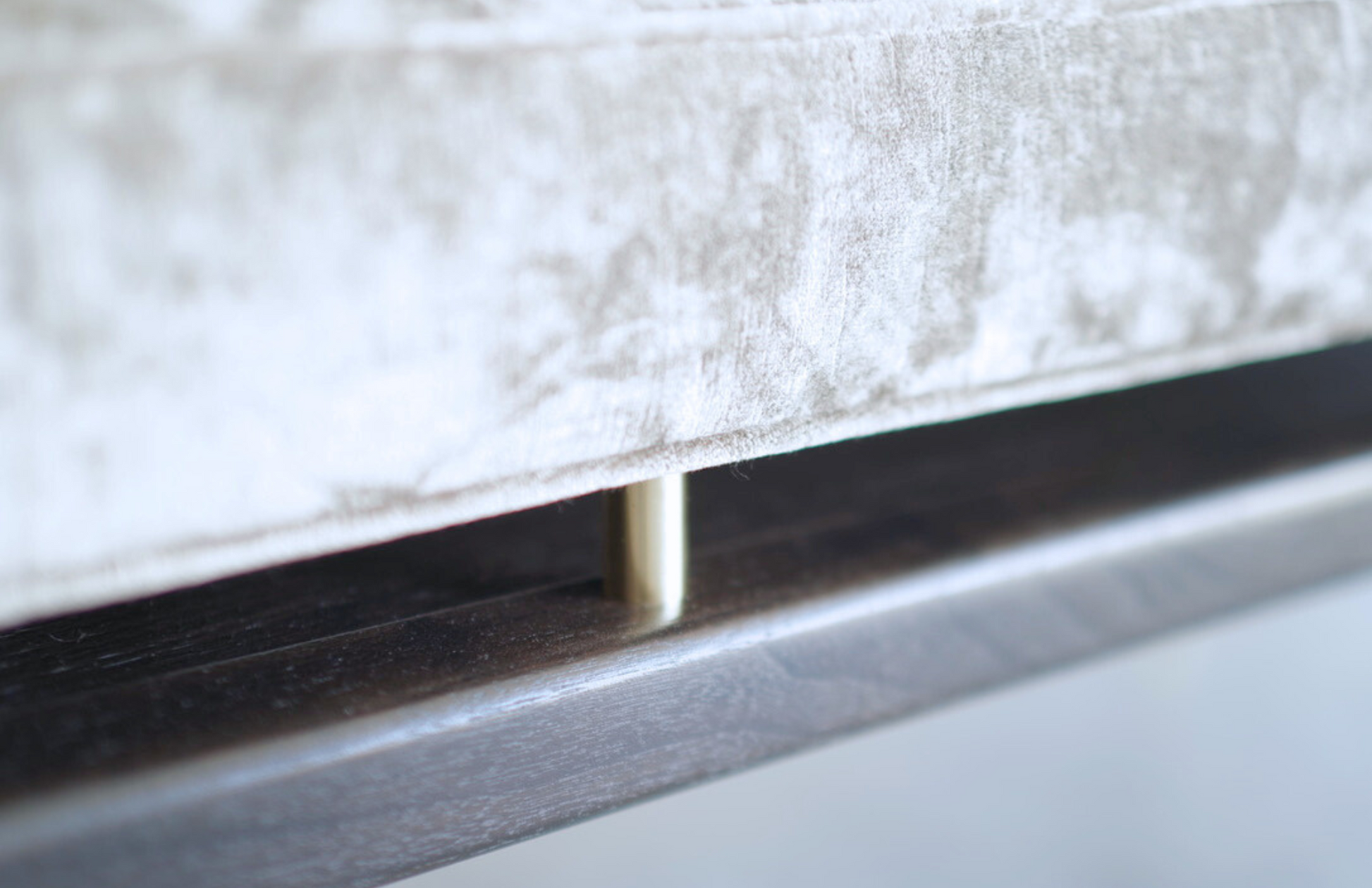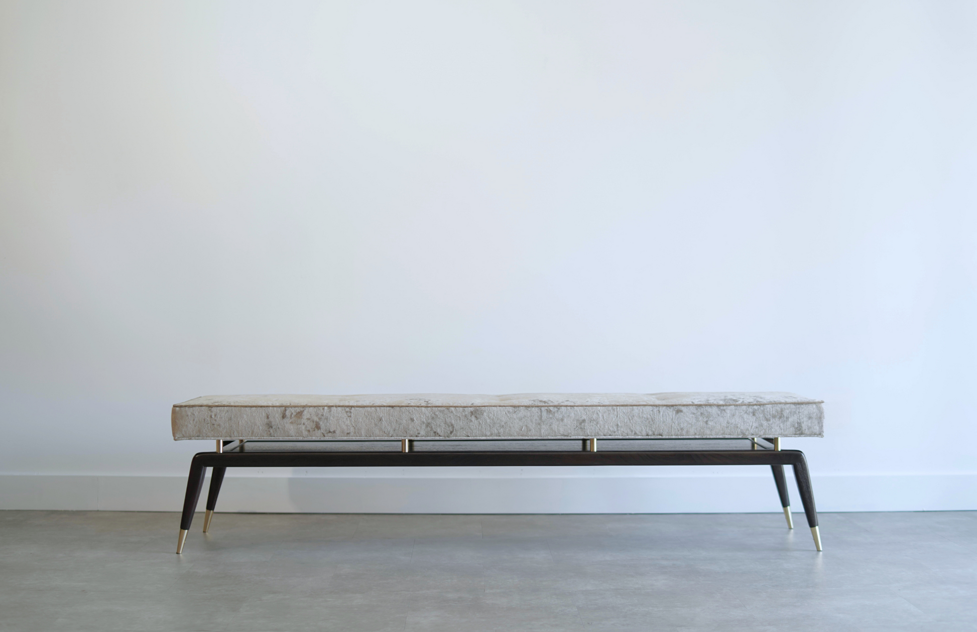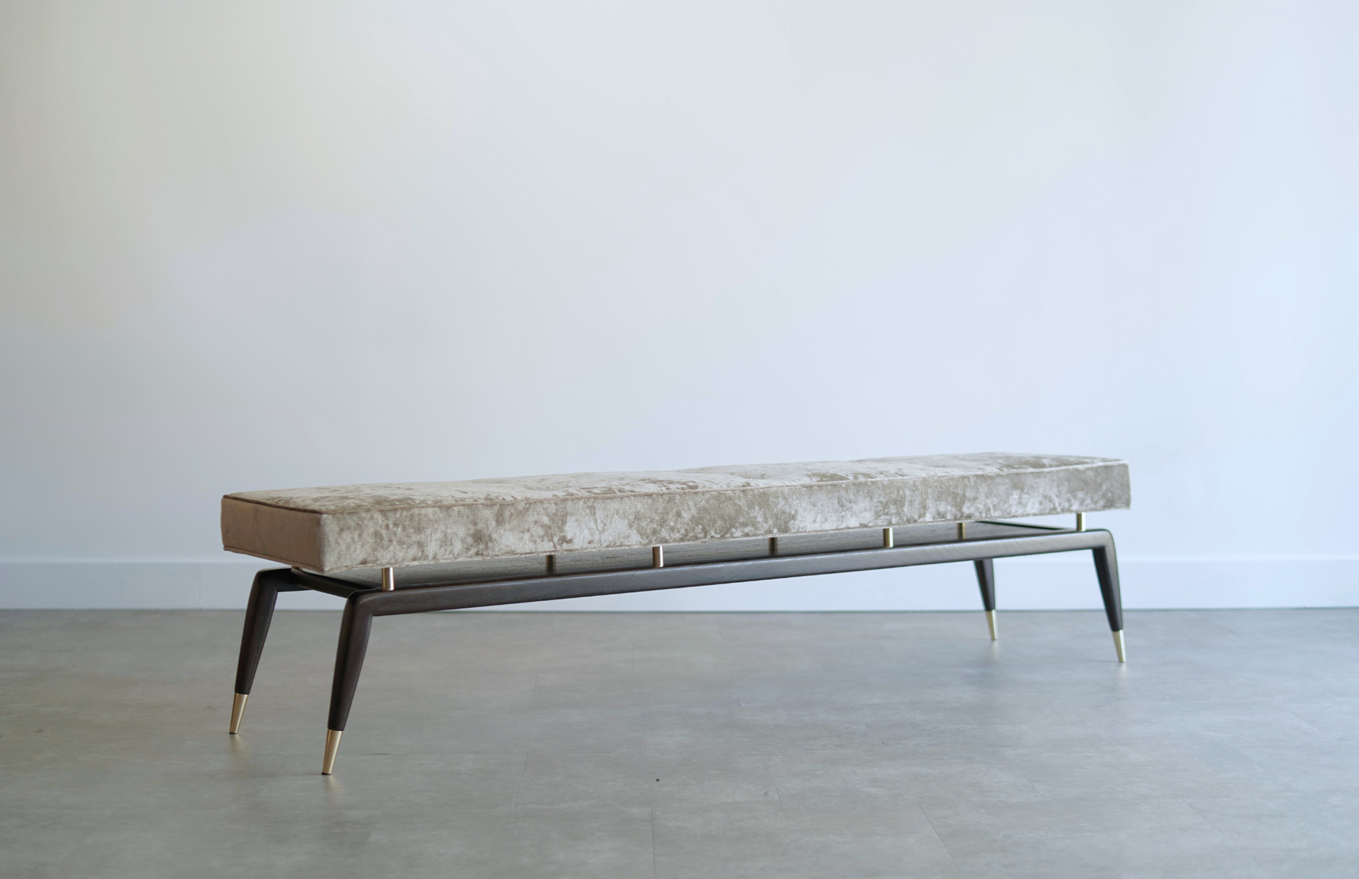 The Gio Bench by Stamford Modern: a perfect blend of Gio Ponti's timeless design and modern functionality. This elegant bench features signature angled legs with metal sabots for added stability and longevity. The upholstered cushion, elevated by metal risers, offers both refined elegance and structural integrity.