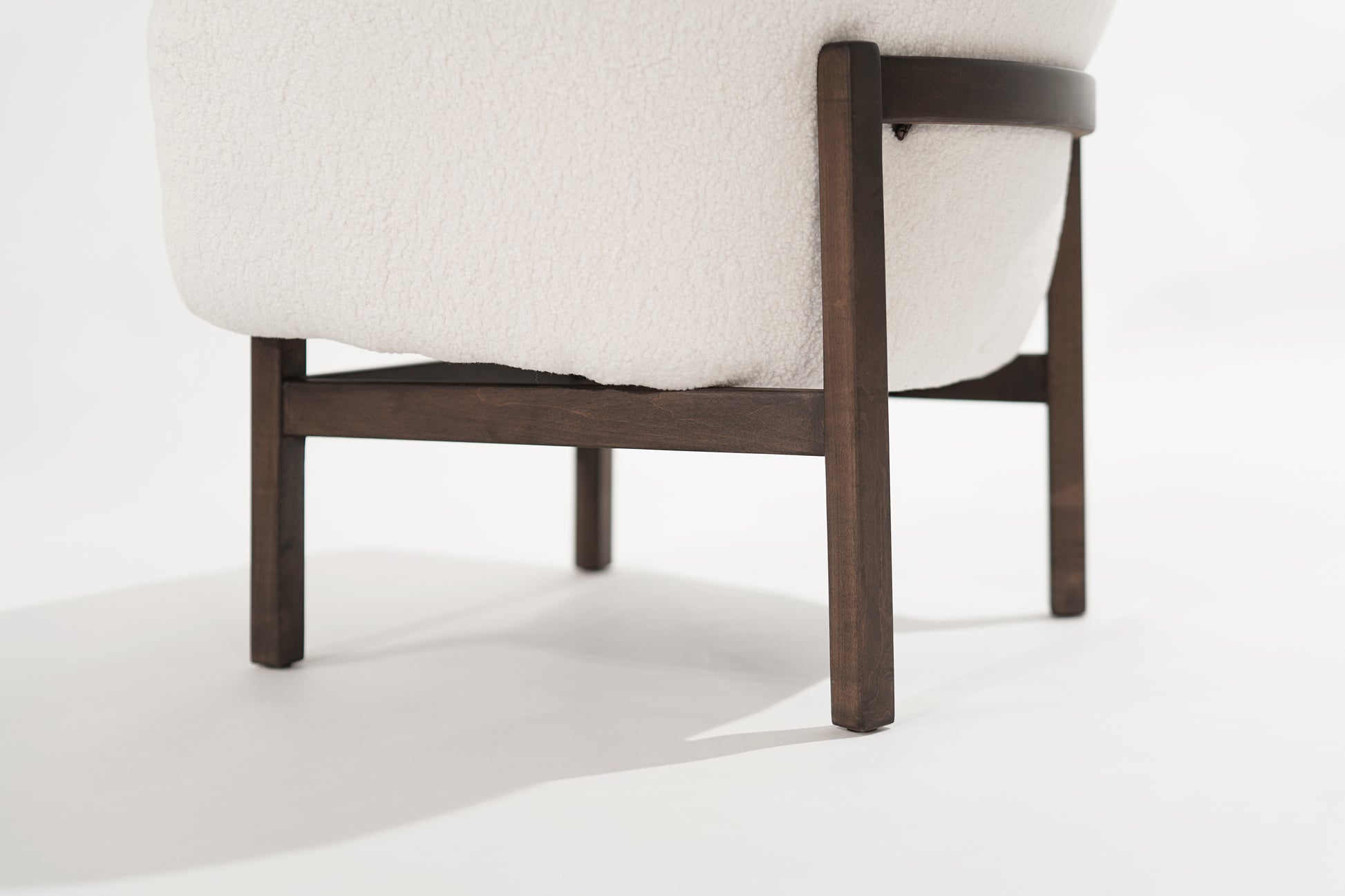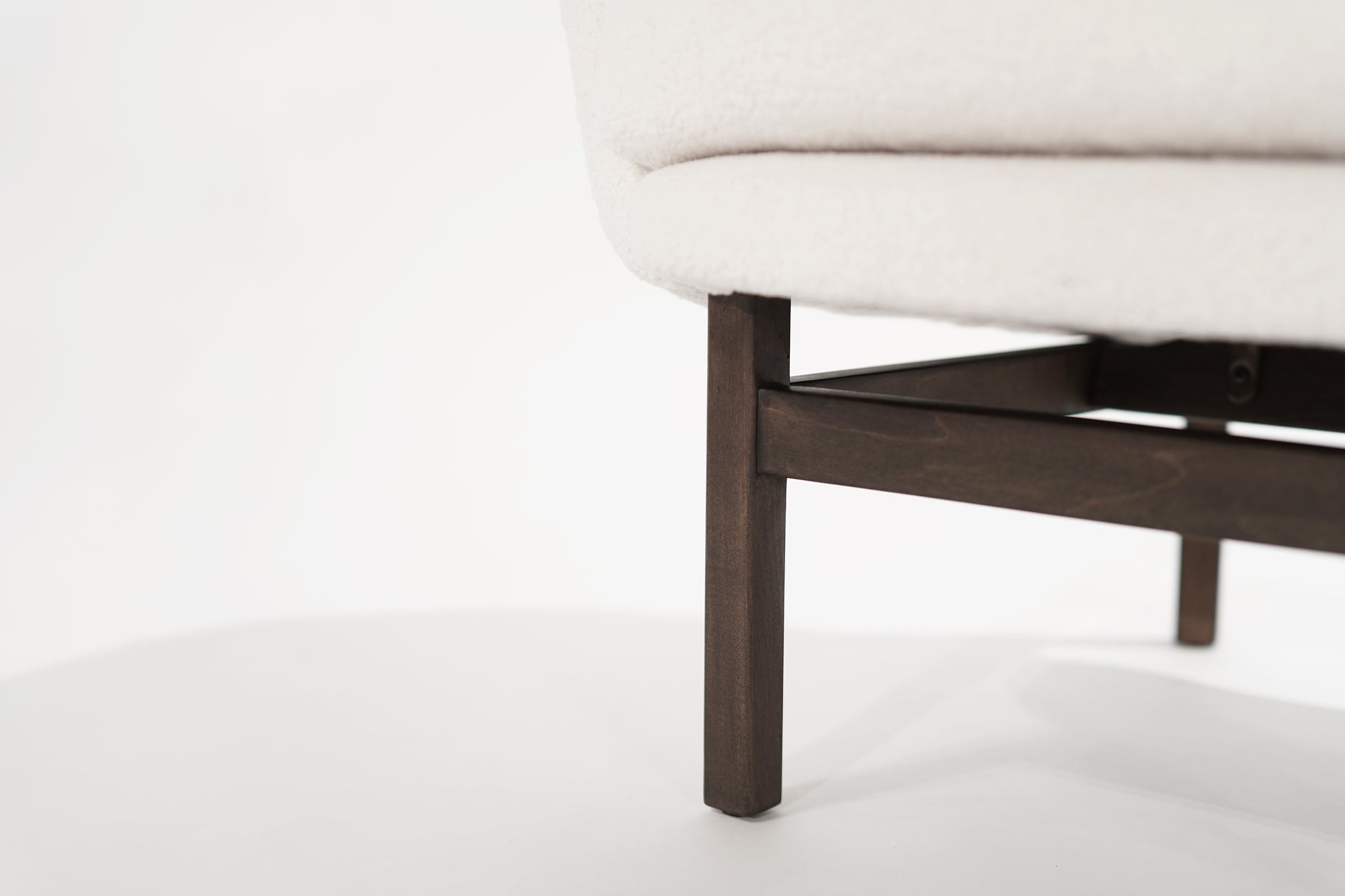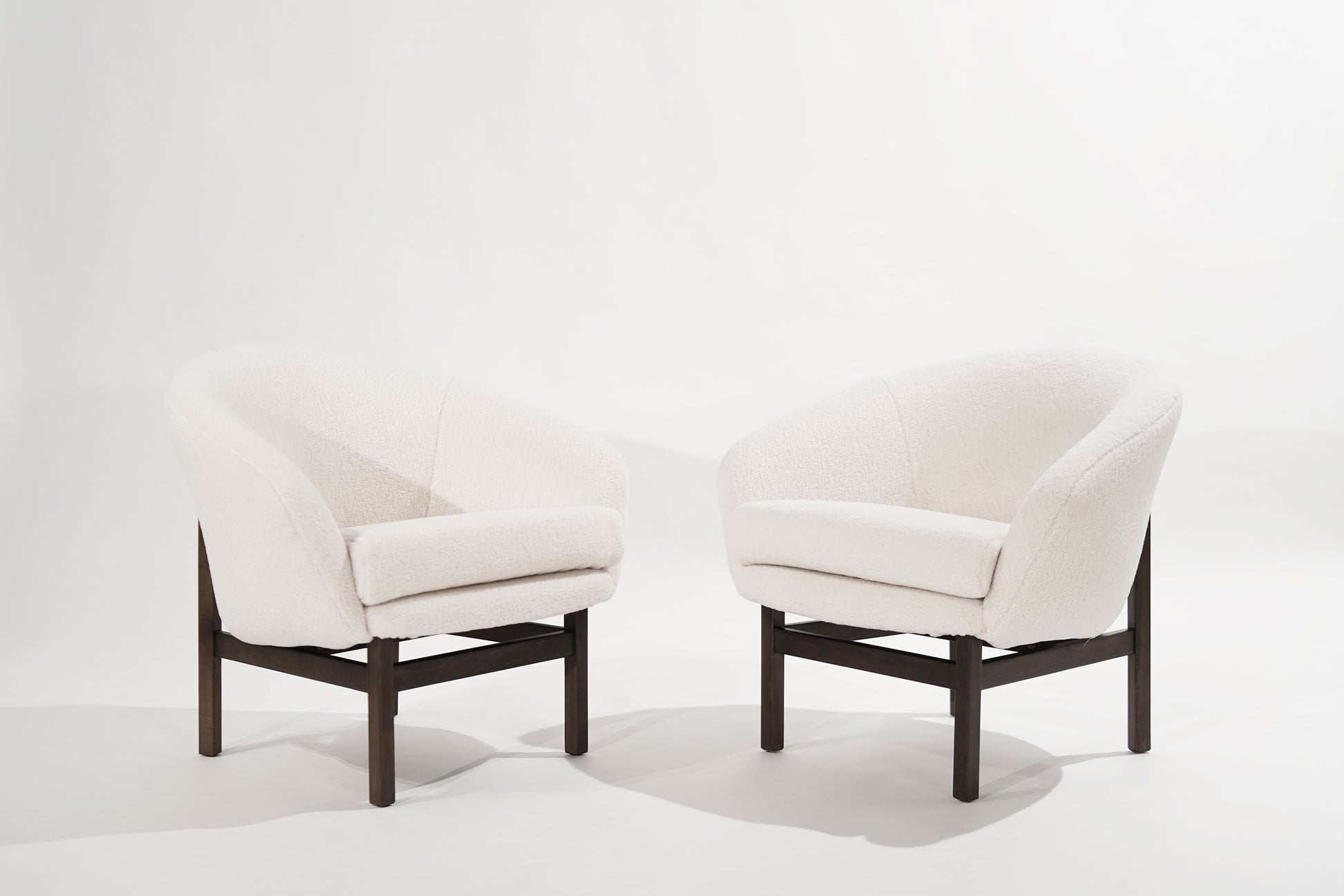 Pair of lounge chairs designed by Lawrence Peabody, circa 1950-1959. Completely restored, all insides including foam, straps, and dacron have been fully updated. Reupholstered in heavy wool by Kravet.