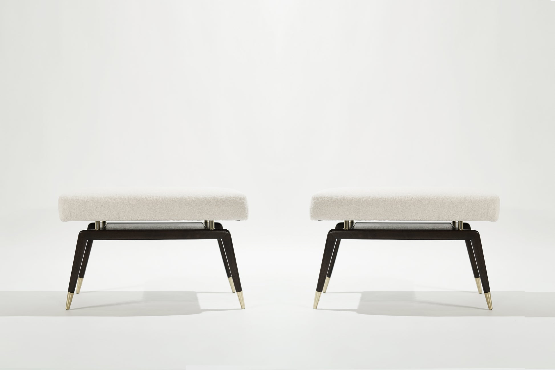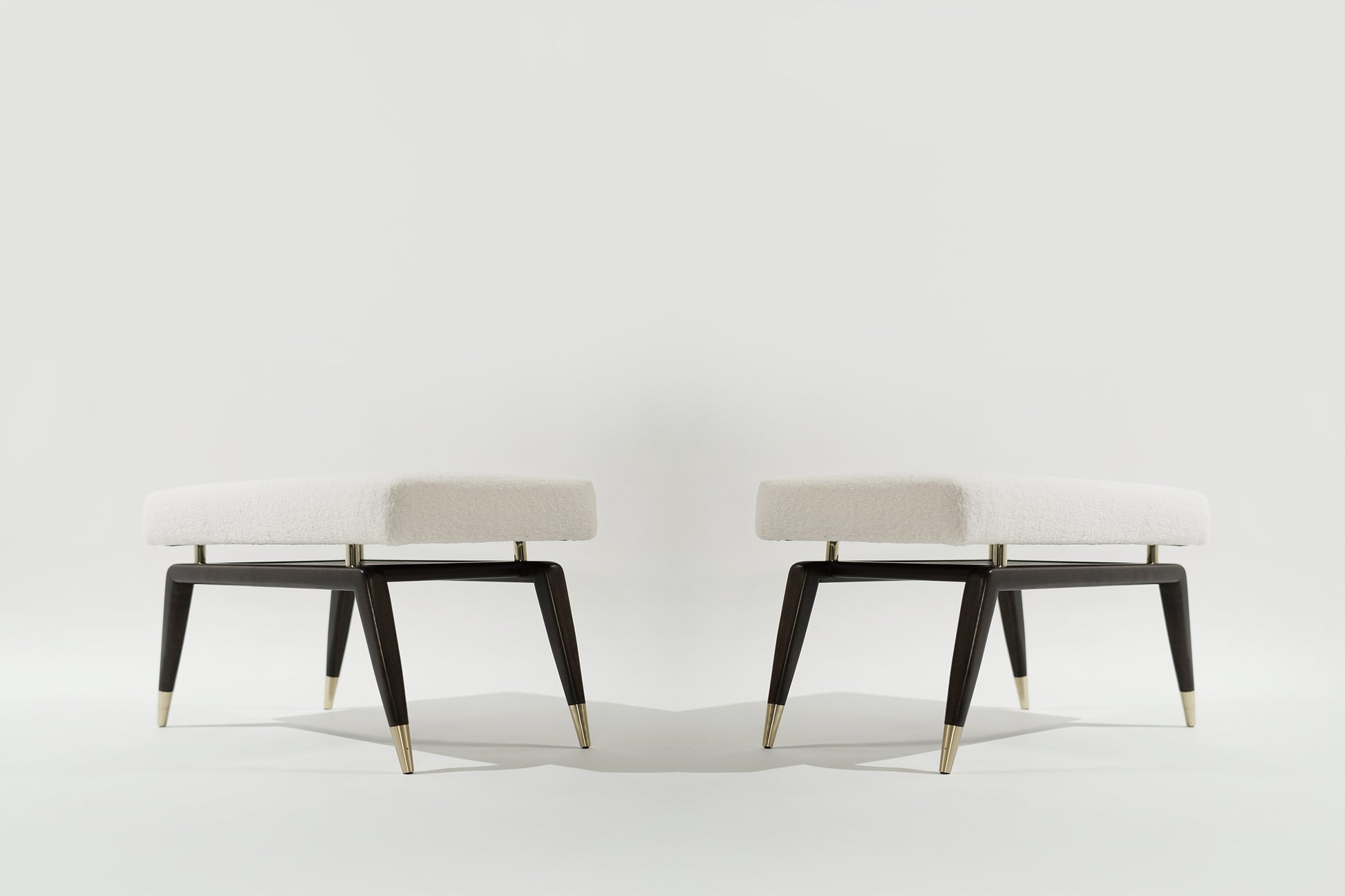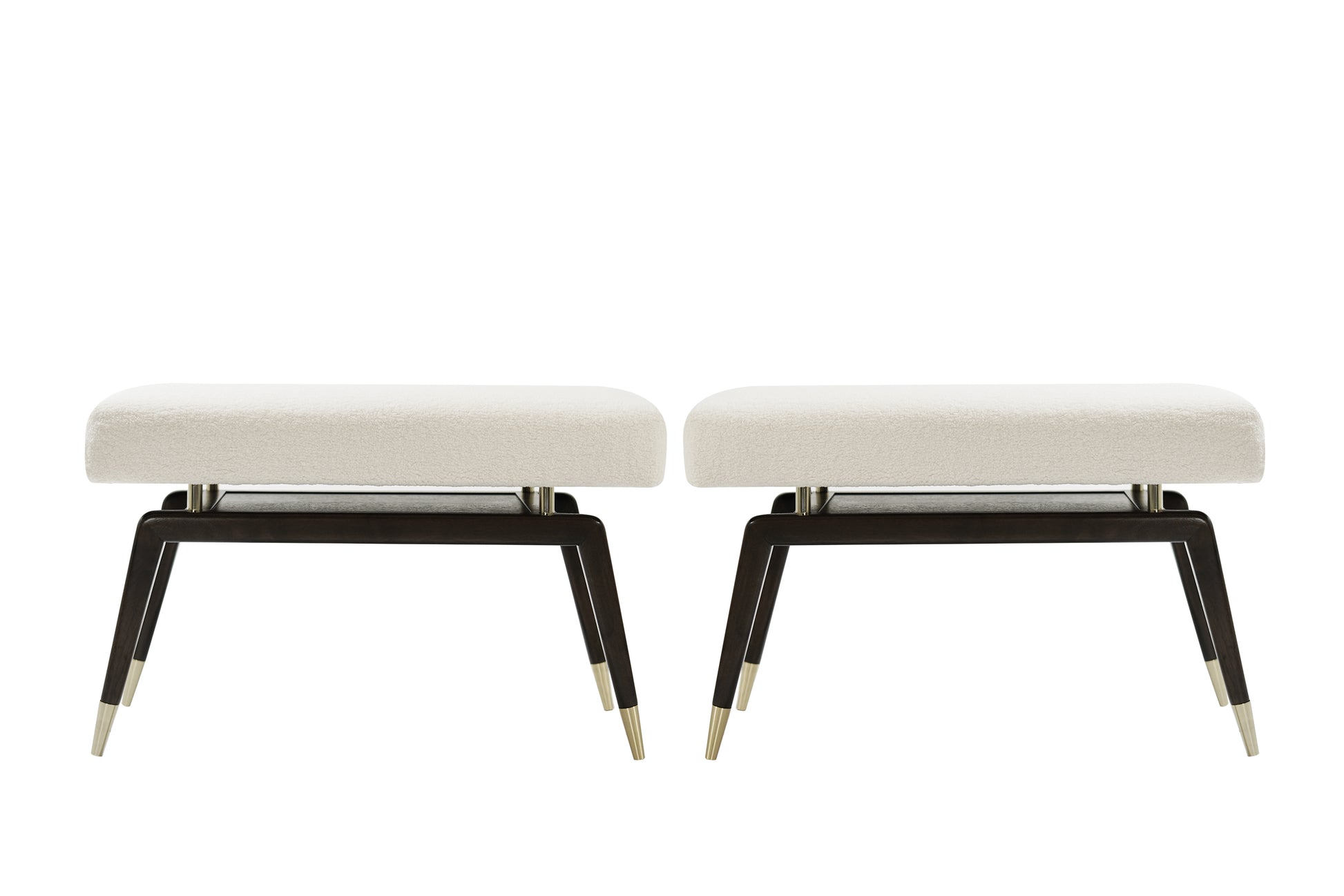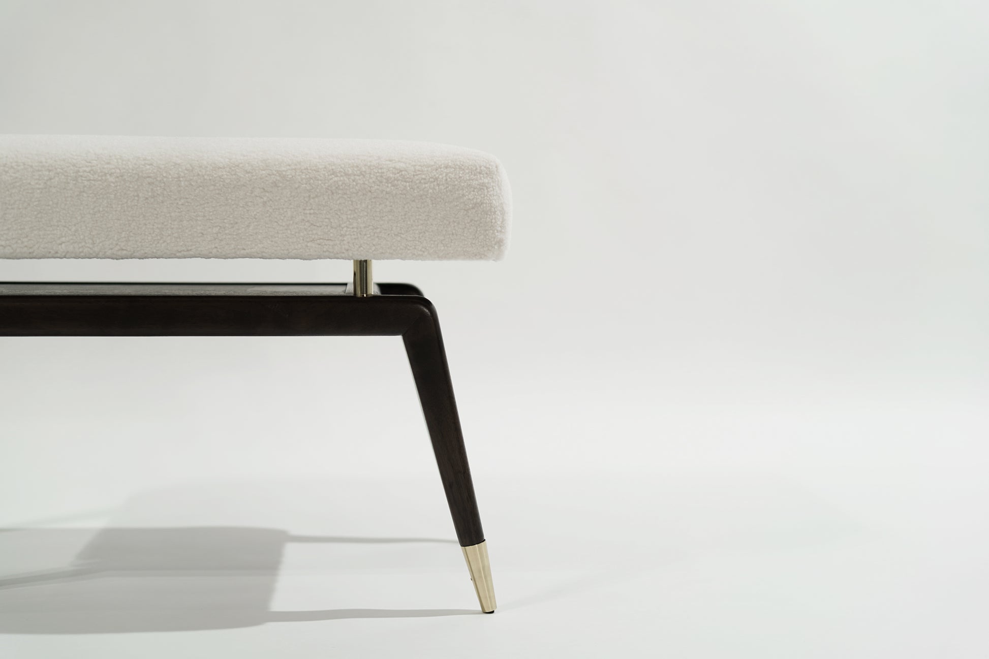 The Gio Bench by Stamford Modern: a perfect blend of Gio Ponti's timeless design and modern functionality. This elegant bench features signature angled legs with metal sabots for added stability and longevity. The upholstered cushion, elevated by metal risers, offers both refined elegance and structural integrity.