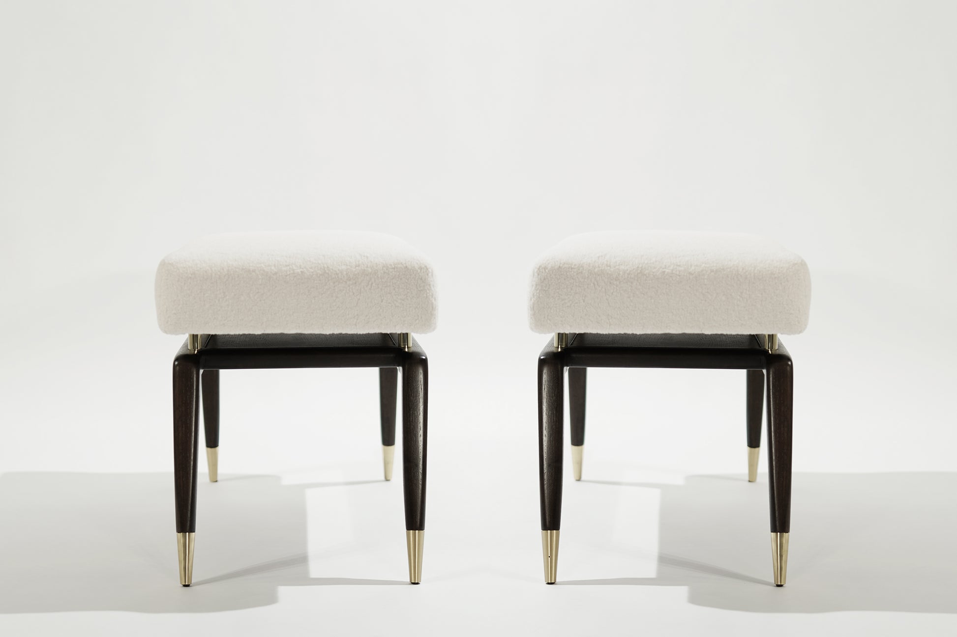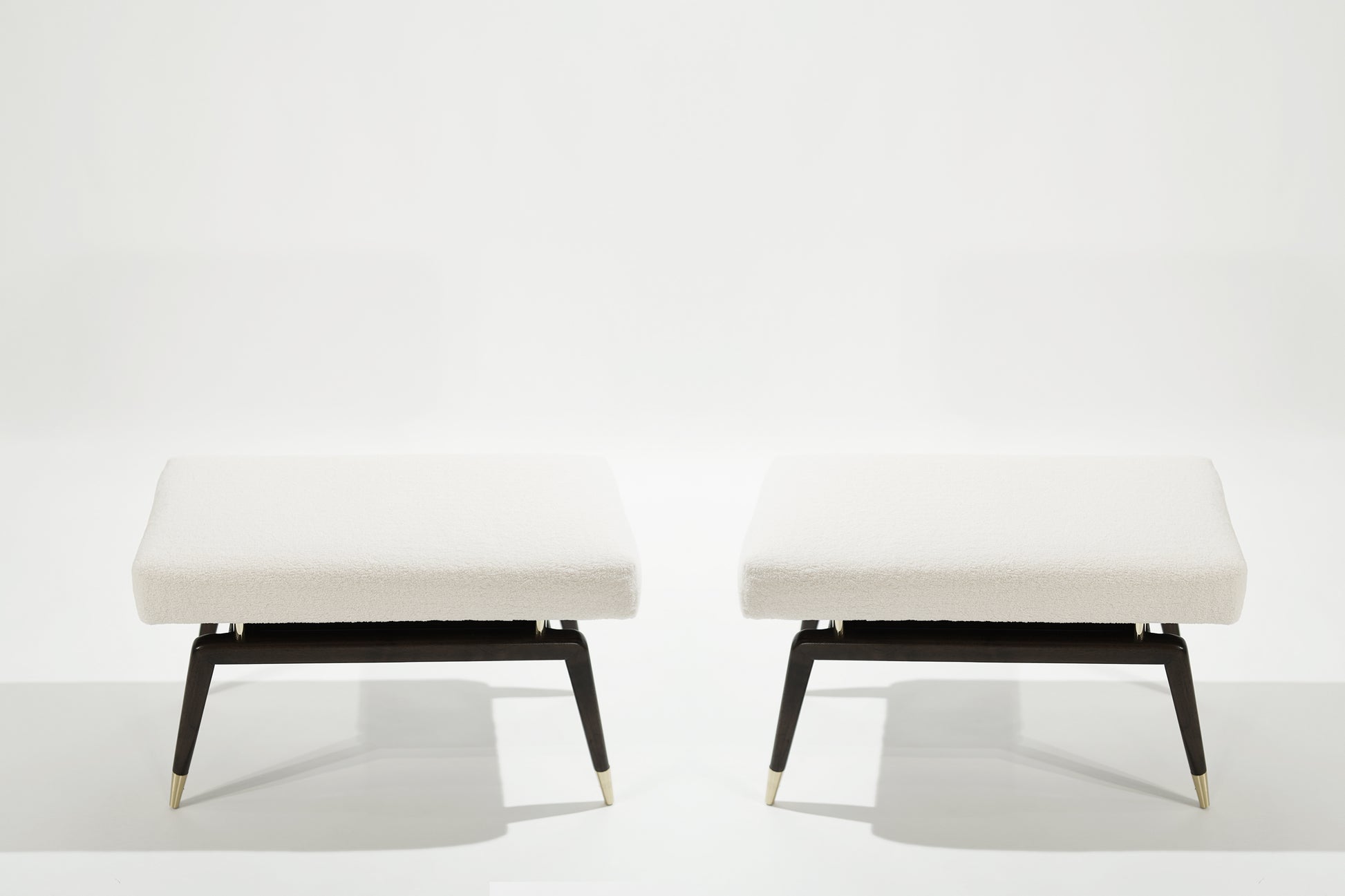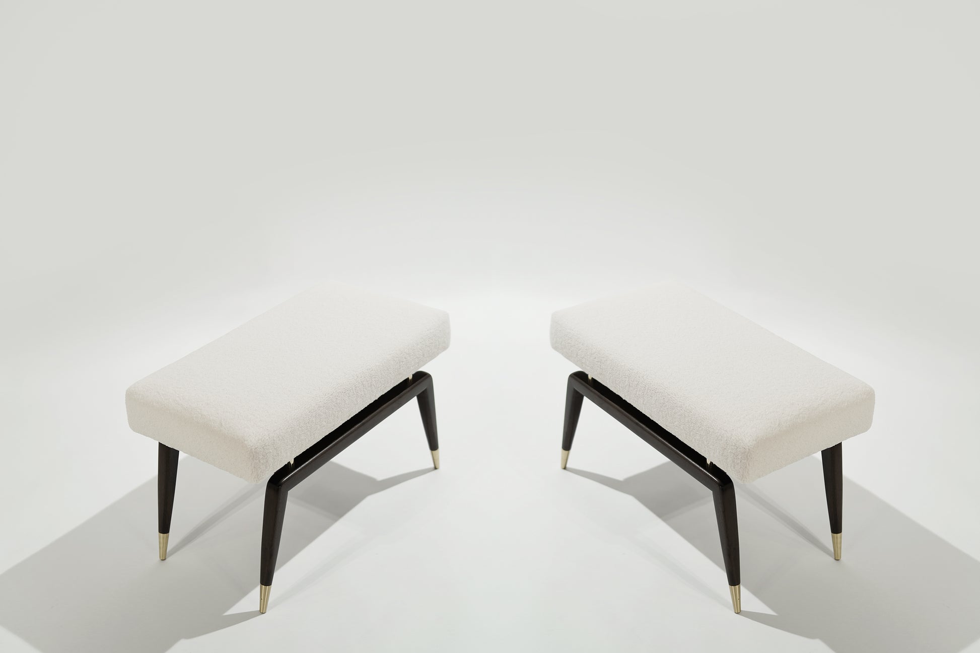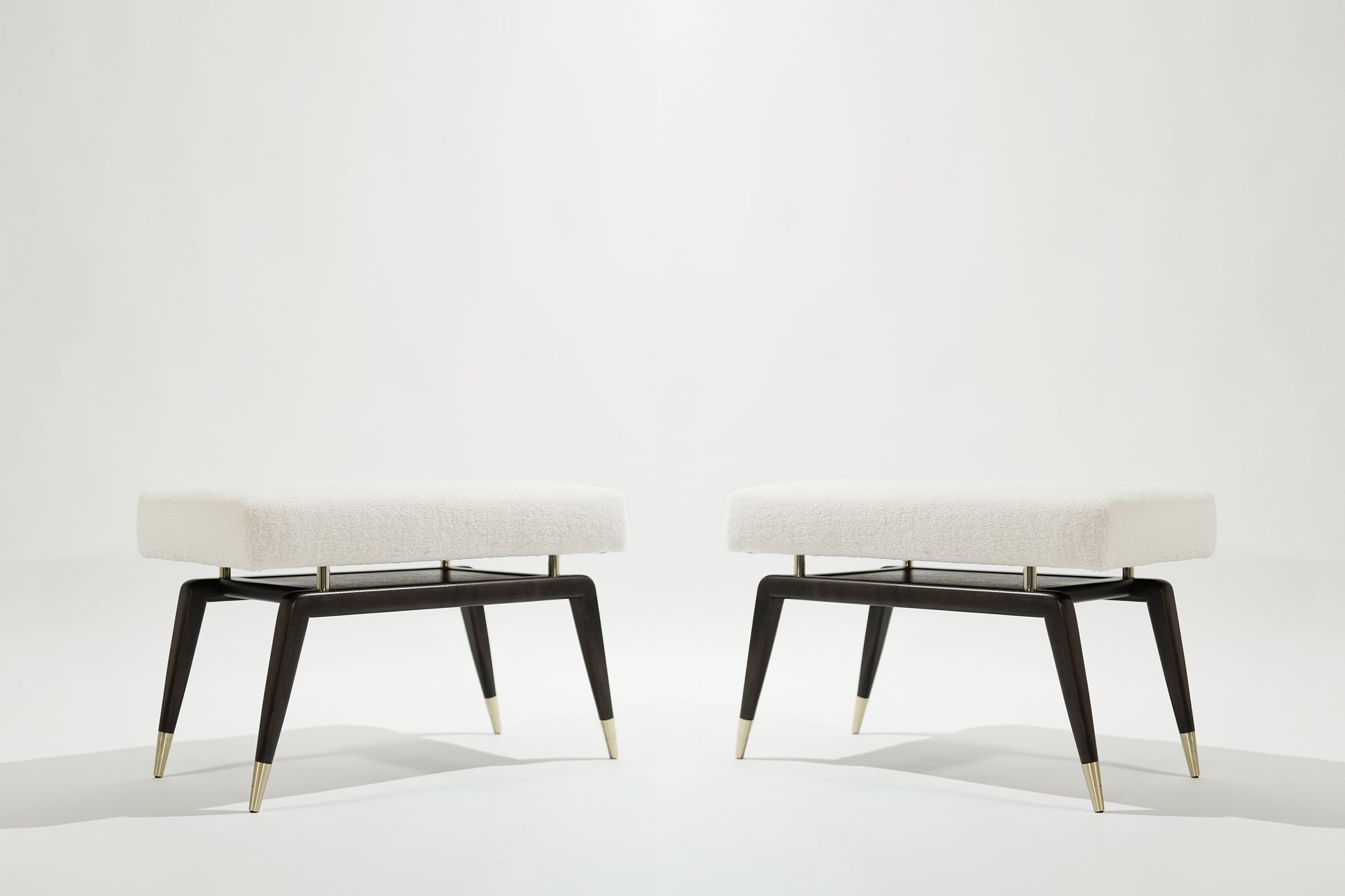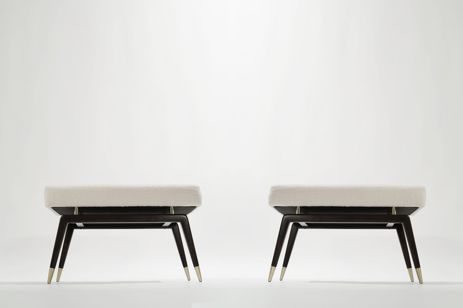 The Gio Bench by Stamford Modern: a perfect blend of Gio Ponti's timeless design and modern functionality. This elegant bench features signature angled legs with metal sabots for added stability and longevity. The upholstered cushion, elevated by metal risers, offers both refined elegance and structural integrity.